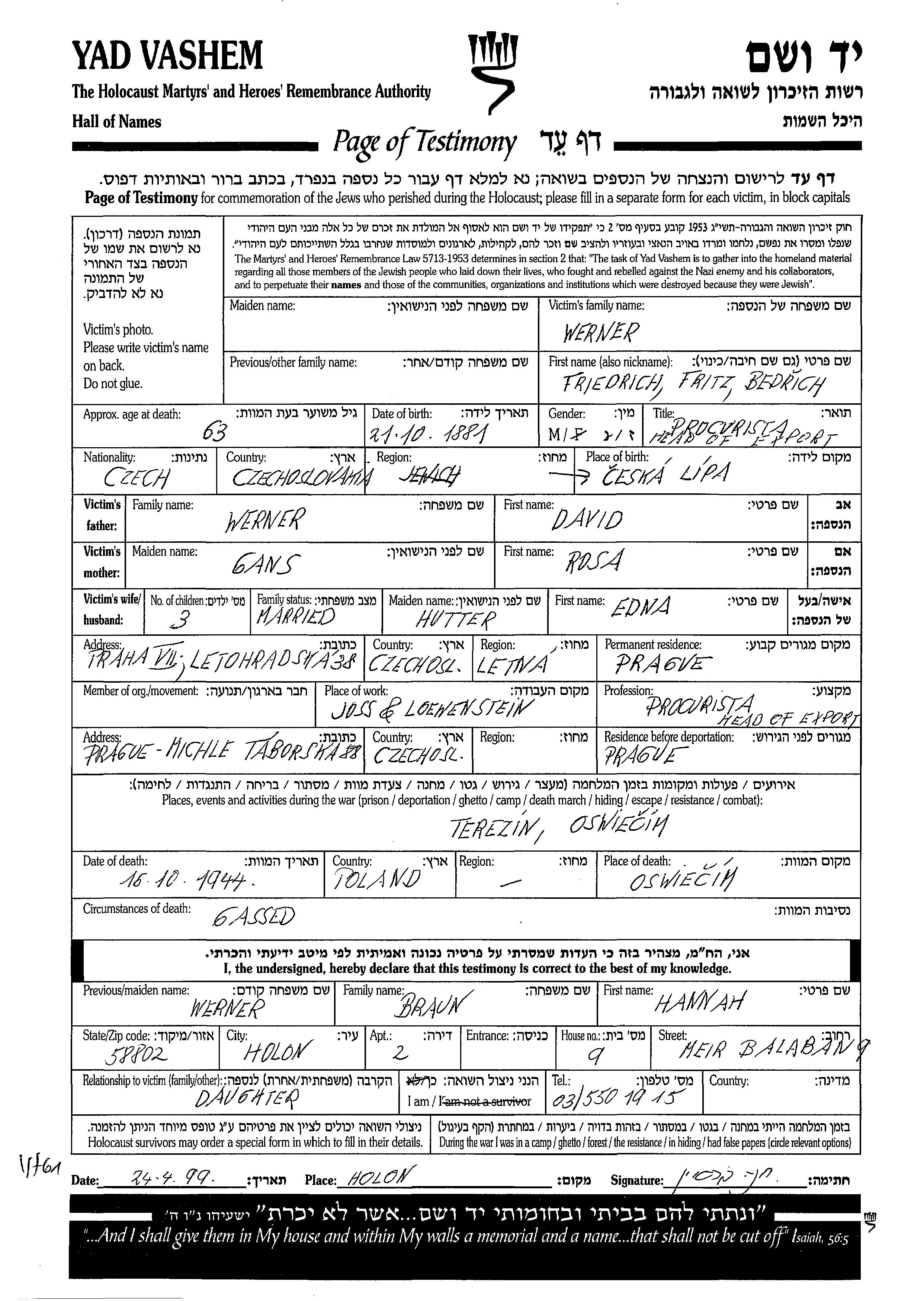 Friedrich Bedrich Werner wurde im Jahr 1881 in Ceska Lipa, Tschechoslowakei geboren. Er war der Sohn von David und Rosa. Er war Procurist und mit Edna, geb. Hutter Verheiratet. Vor dem Zweiten Weltkrieg lebte er in Prague, Tschechoslowakei. Während des Krieges war er in Prague, Tschechoslowakei.