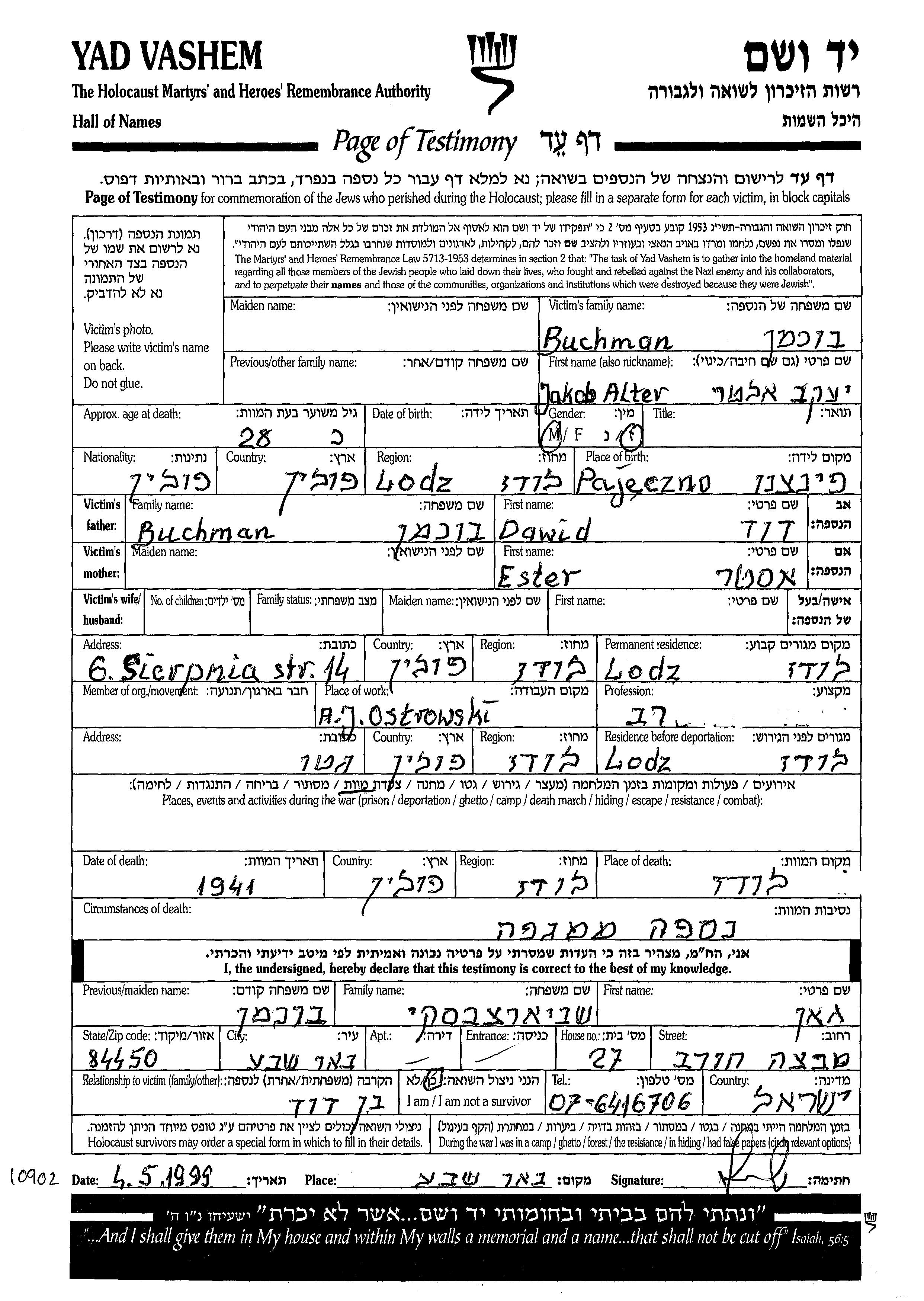 Jakob Alter Buchman wurde in Pajeczno, Polen geboren. Er war der Sohn von Dawid und Ester. Er war Rabbiner. Vor dem Zweiten Weltkrieg lebte er in Lodz, Polen. Während des Krieges war er in Lodz, Polen.