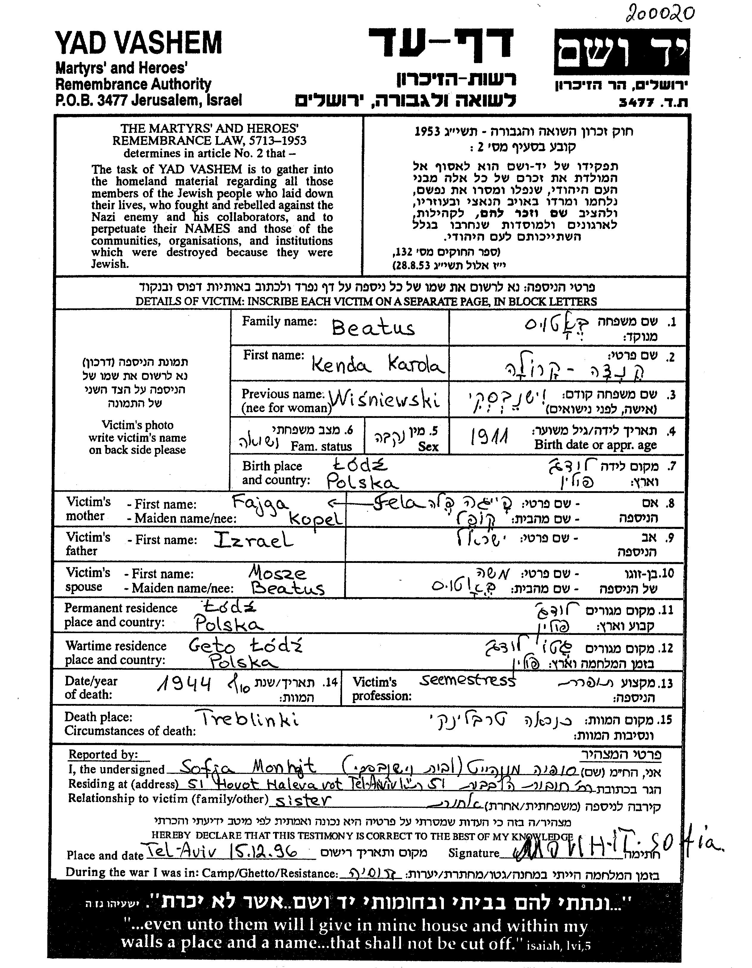 Kenda Karola Batos, geb. Wisniewski wurde im Jahr 1910 in Lodz, Polen geboren. Vor dem Zweiten Weltkrieg lebte sie in Lodz, Polen.