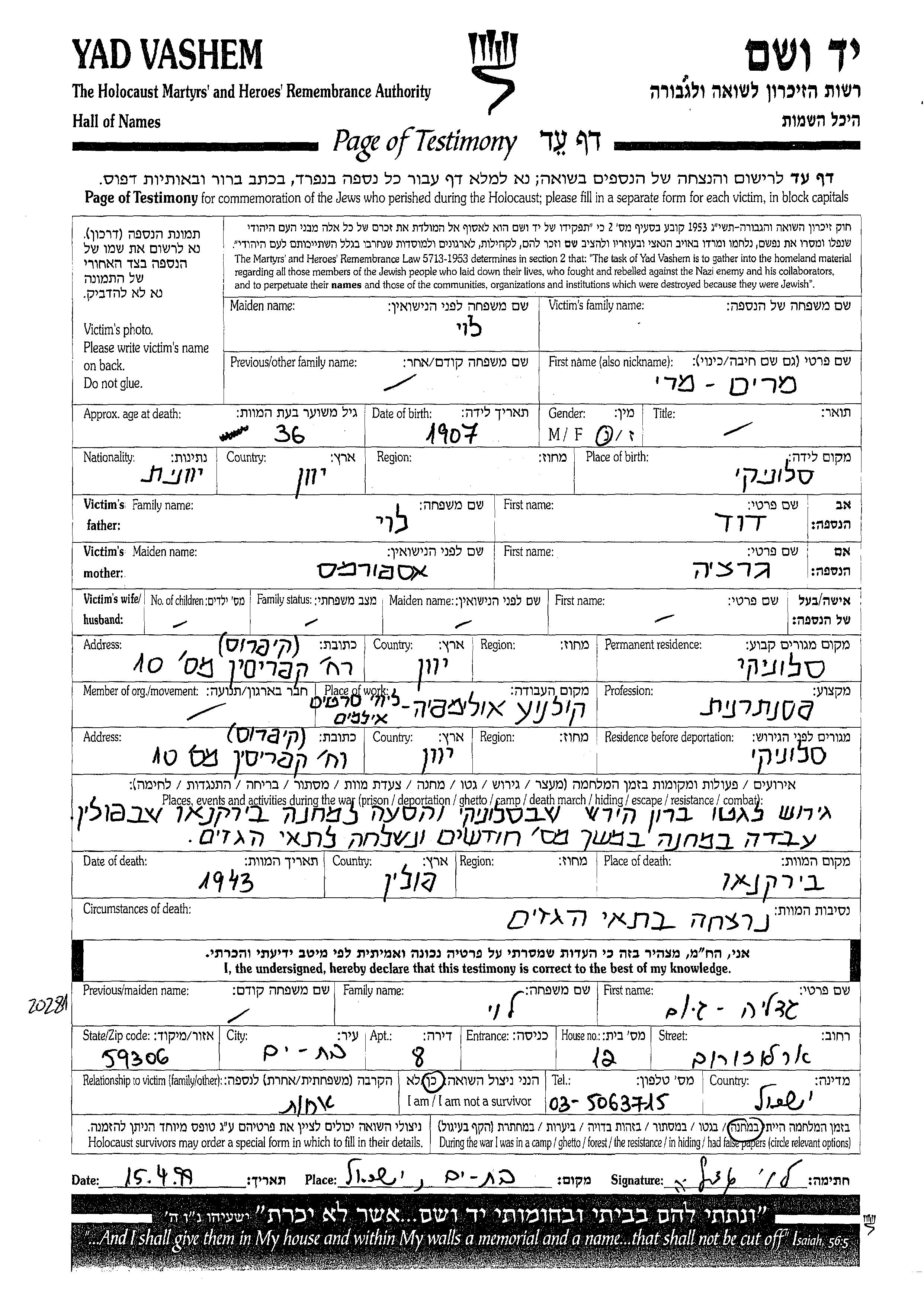 Miriam Mari Name unbekannt, geb. Levi wurde im Jahr 1907 in Saloniki, Griechenland geboren. Sie war die Tochter von David und Grasia. Sie war Pianist/-in. Vor dem Zweiten Weltkrieg lebte sie in Saloniki, Griechenland. Während des Krieges war sie in Saloniki, Griechenland.