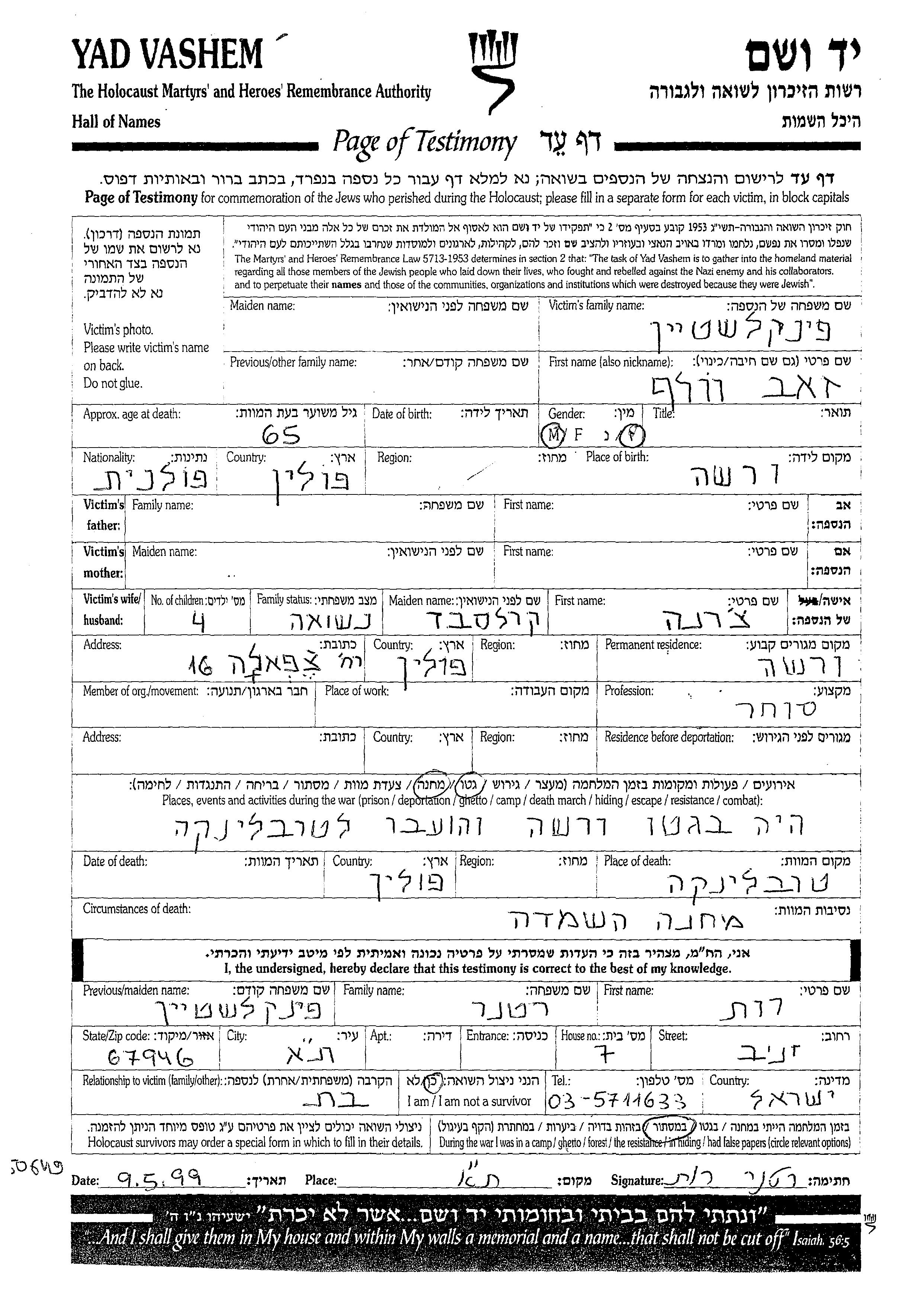 Zeev Volf Finkelshtein wurde in Warsaw, Polen geboren. Er war Kaufmann/-frau und mit Charna, geb. Karlsbad Verheiratet. Vor dem Zweiten Weltkrieg lebte er in Warsaw, Polen.