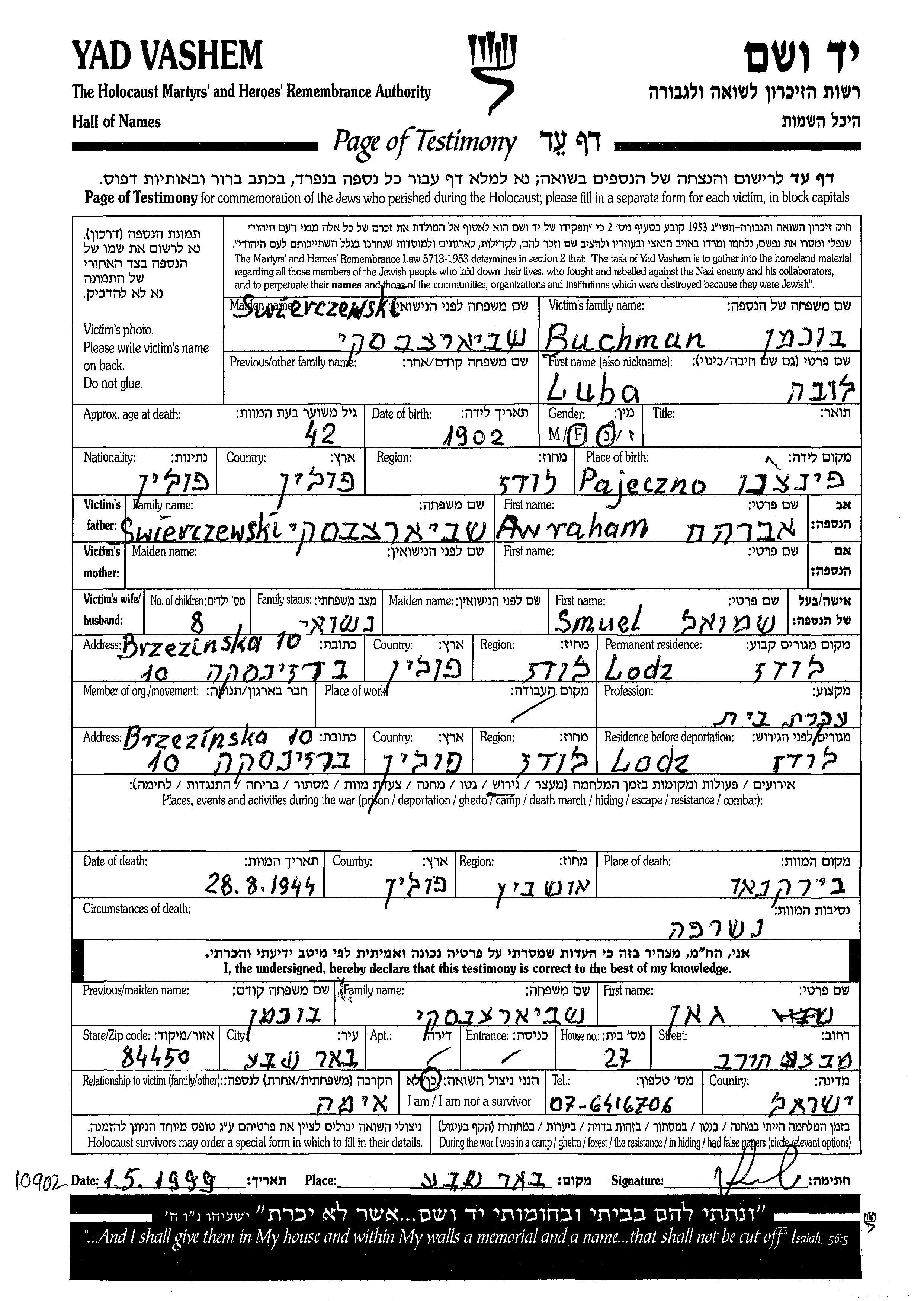 Luba Buchman, geb. Swierczewski wurde im Jahr 1902 in Pajeczno, Polen geboren. Sie war die Tochter von Awraham. Sie war Hausfrau und mit Smuel Verheiratet. Vor dem Zweiten Weltkrieg lebte sie in Lodz, Polen. Während des Krieges war sie in Lodz, Polen.