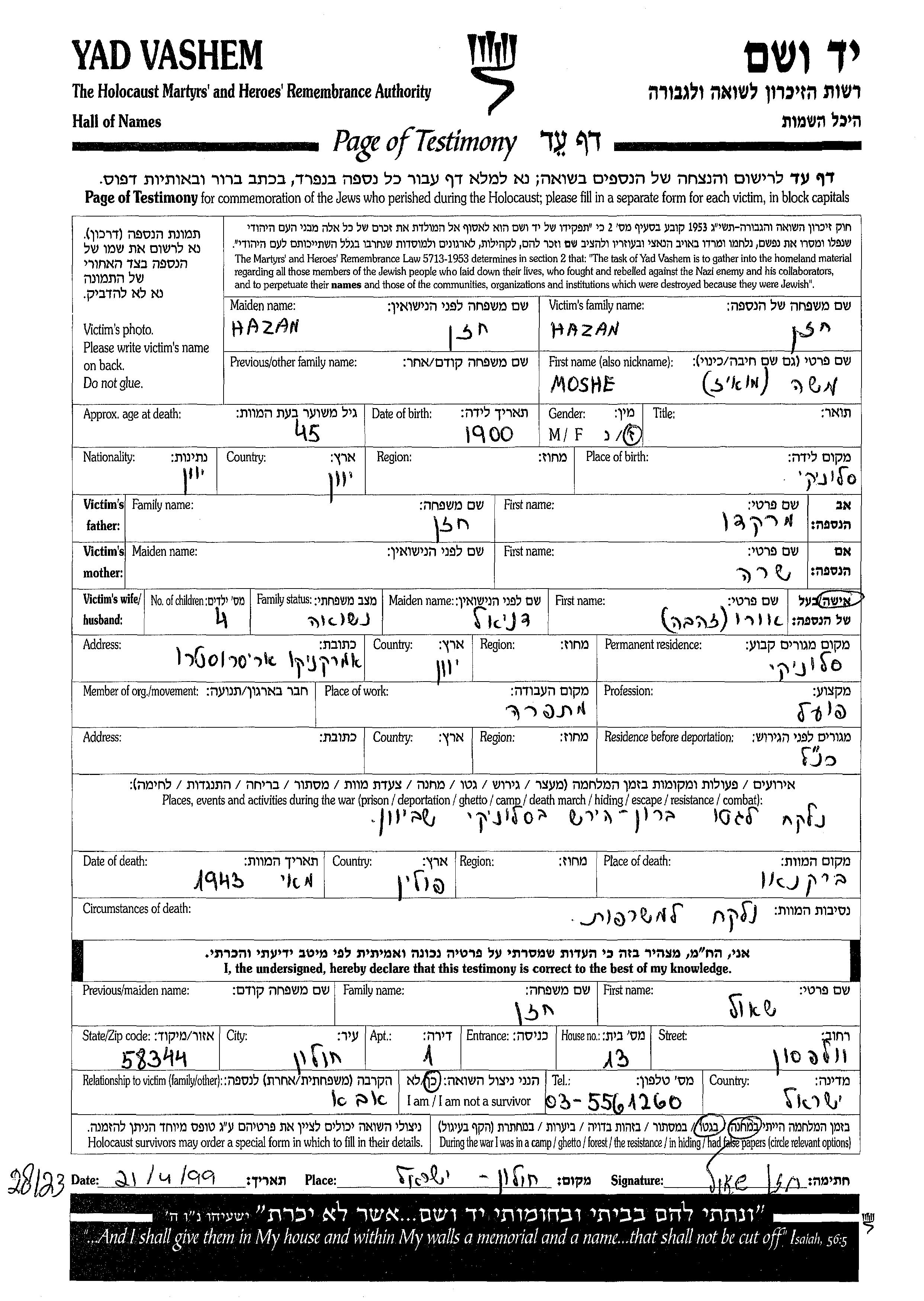 Moshe Hazan wurde im Jahr 1900 in Saloniki, Griechenland geboren. Er war der Sohn von Merkado und Sara. Er war Arbeiter/-in und mit Zahava Uri, geb. Daniel Verheiratet. Vor dem Zweiten Weltkrieg lebte er in Saloniki, Griechenland. Während des Krieges war er in Saloniki, Griechenland.