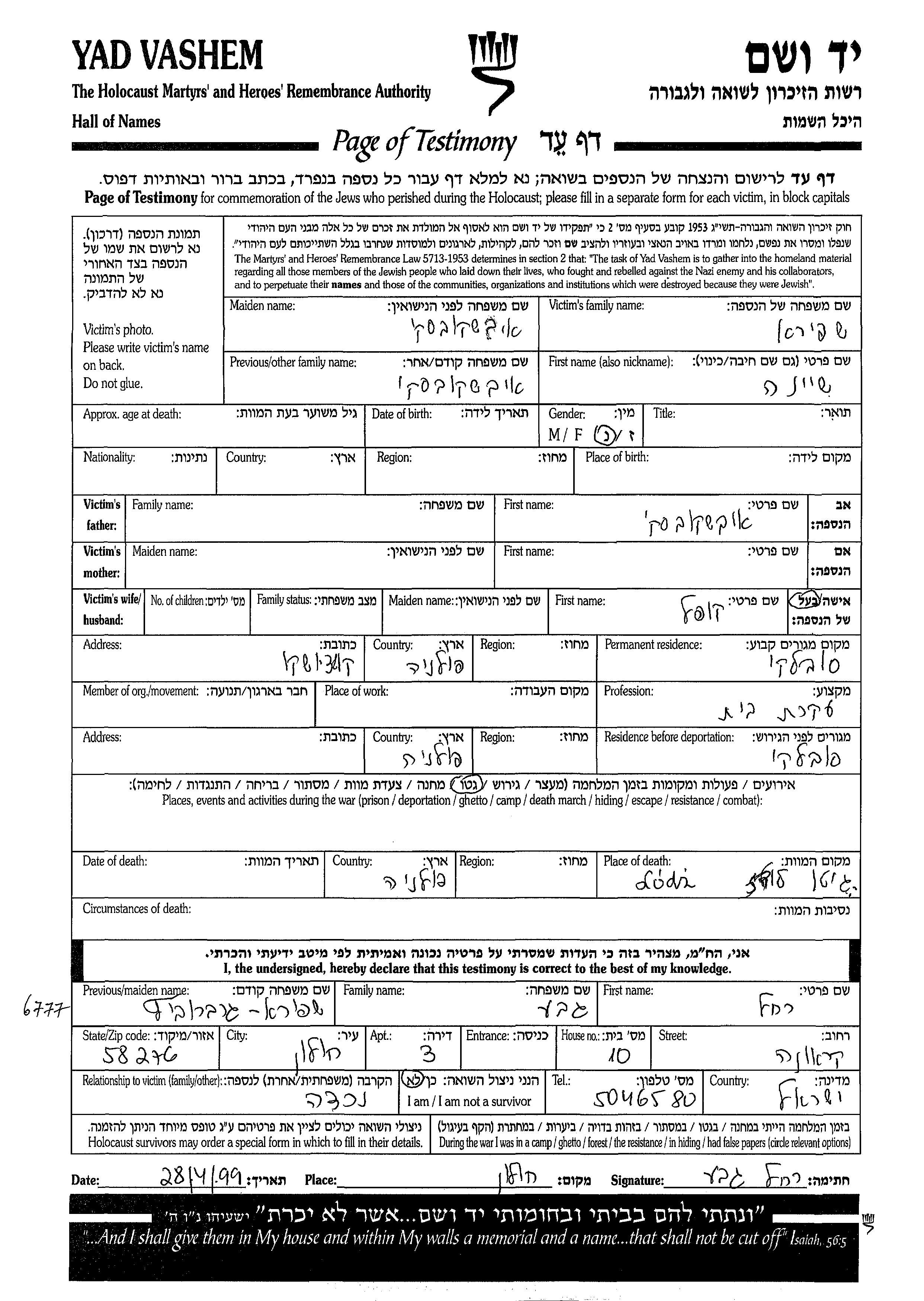 Shapira Sheina Sovalek, Polen Gedenkblatt