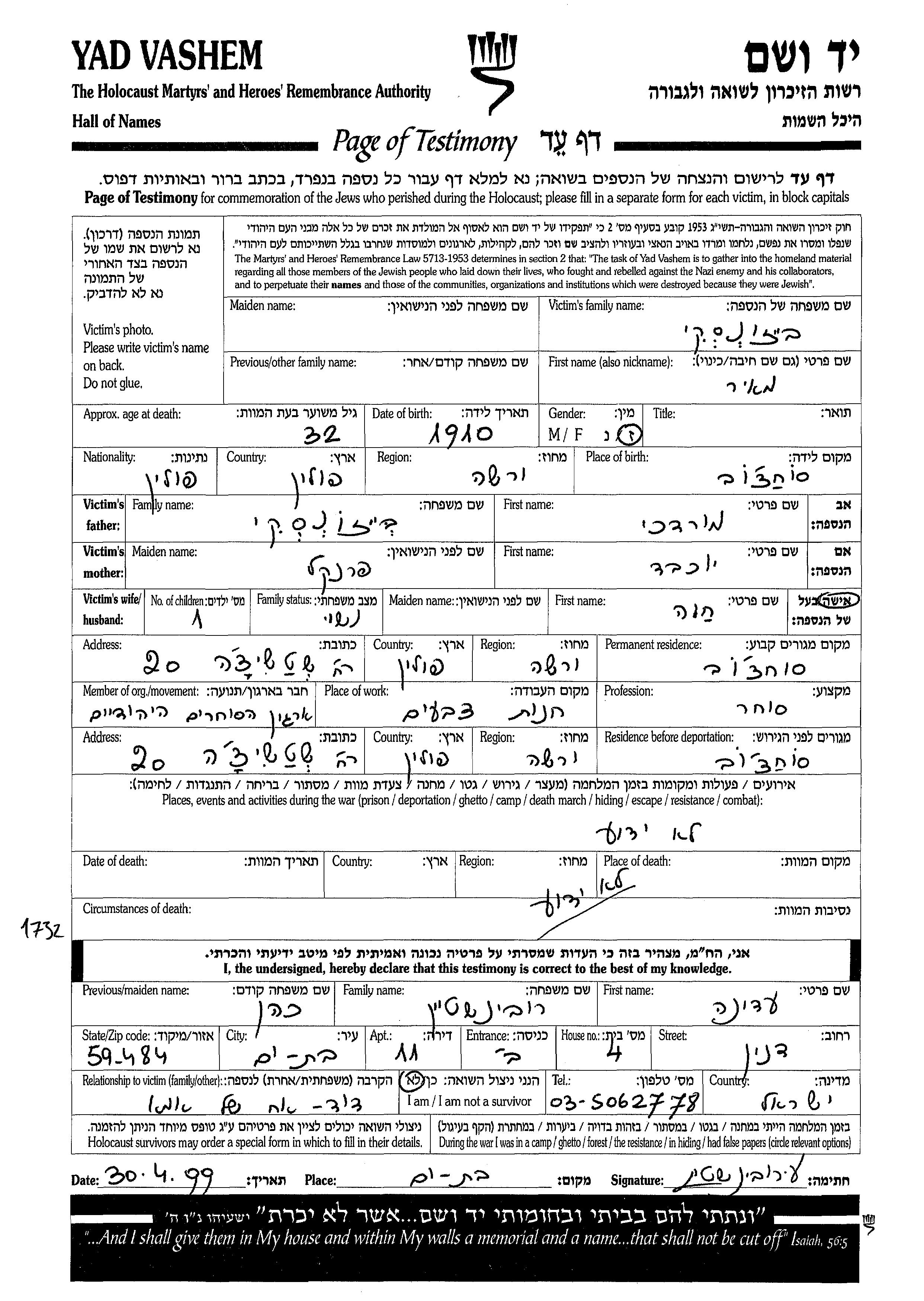 Meir Bieżuński wurde im Jahr 1910 in Sochaczew, Polen geboren. Er war der Sohn von Mordechai und Yokheved. Er war Kaufmann/-frau und mit Khava Verheiratet. Vor dem Zweiten Weltkrieg lebte er in Sochaczew, Polen. Während des Krieges war er in Sochaczew, Polen.