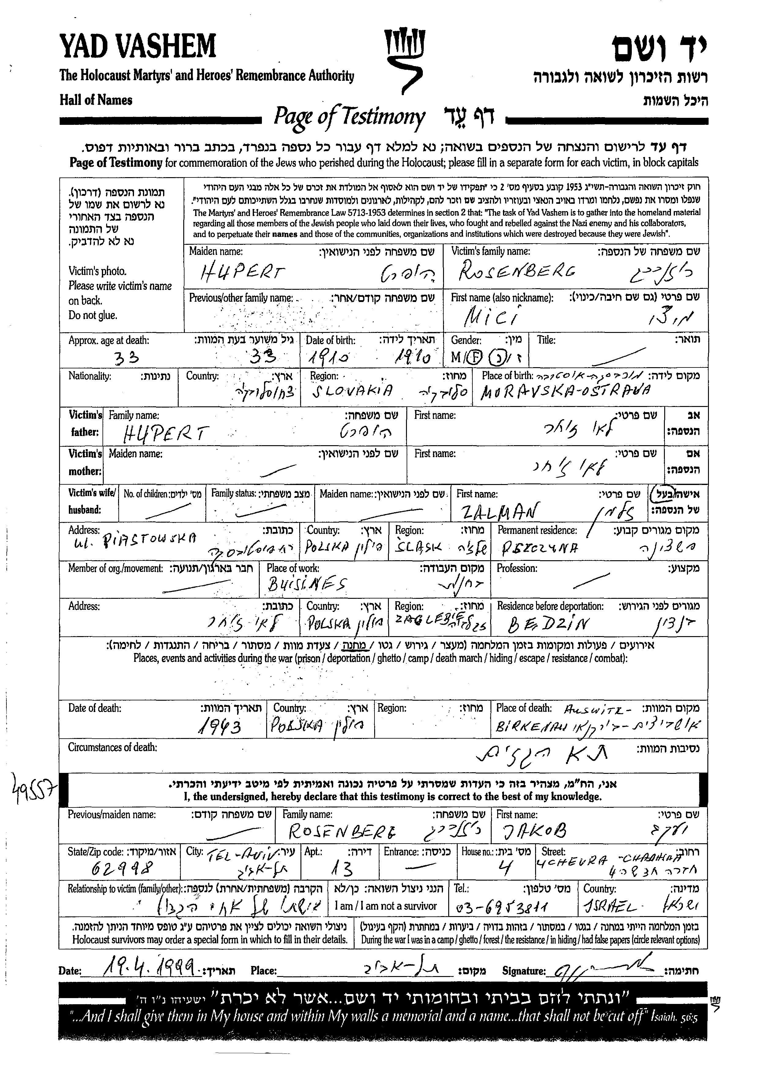 Mici Rosenberg, geb. Hupert wurde im Jahr 1910 in Moravska Ostrava, Tschechoslowakei geboren. Vor dem Zweiten Weltkrieg lebte sie in Pszczyna, Polen. Während des Krieges war sie in Bendin, Polen.