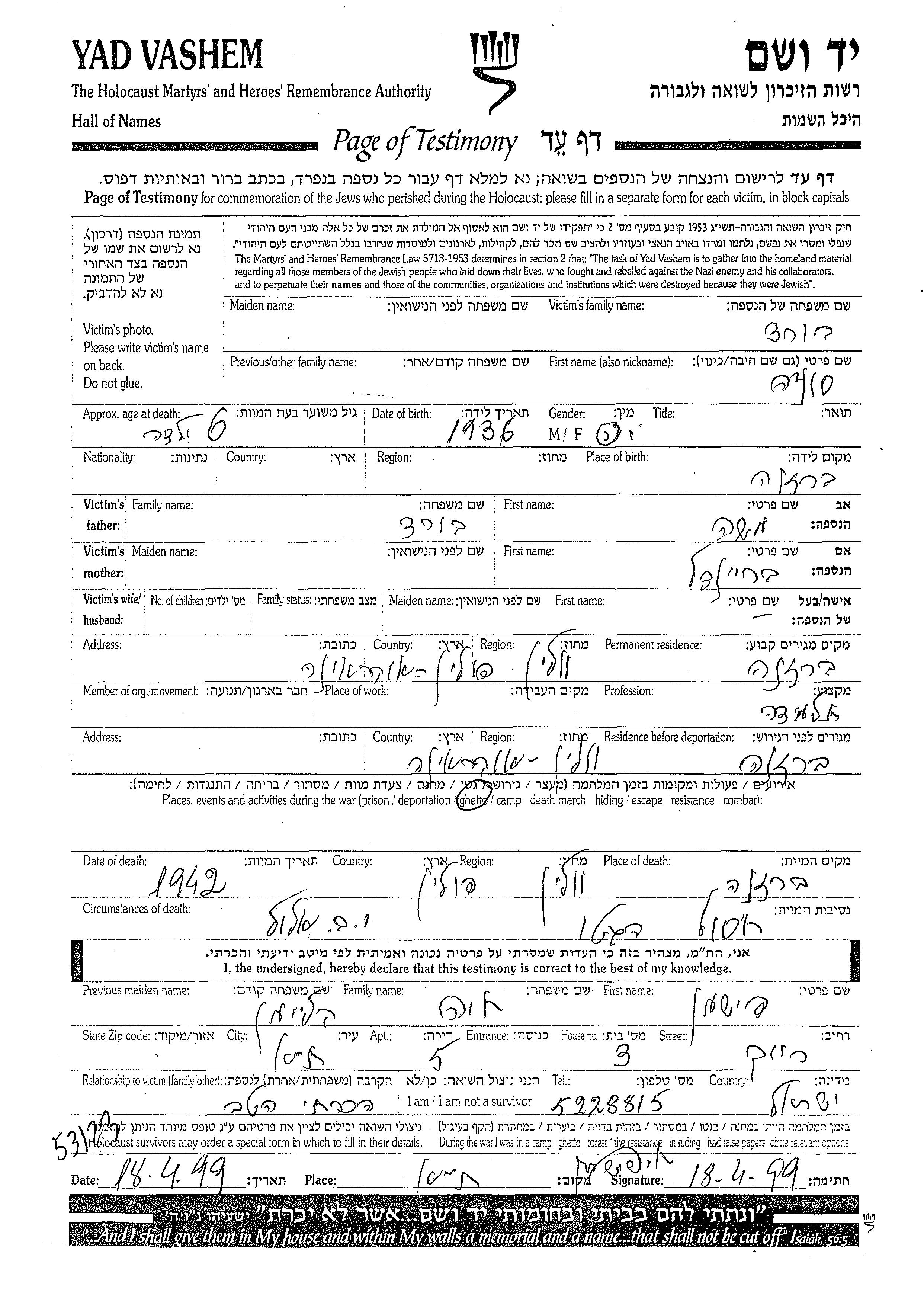 Sonia wurde in der Schoah ermordet. Todesort: Berezne, Polen im Jahr 1942.