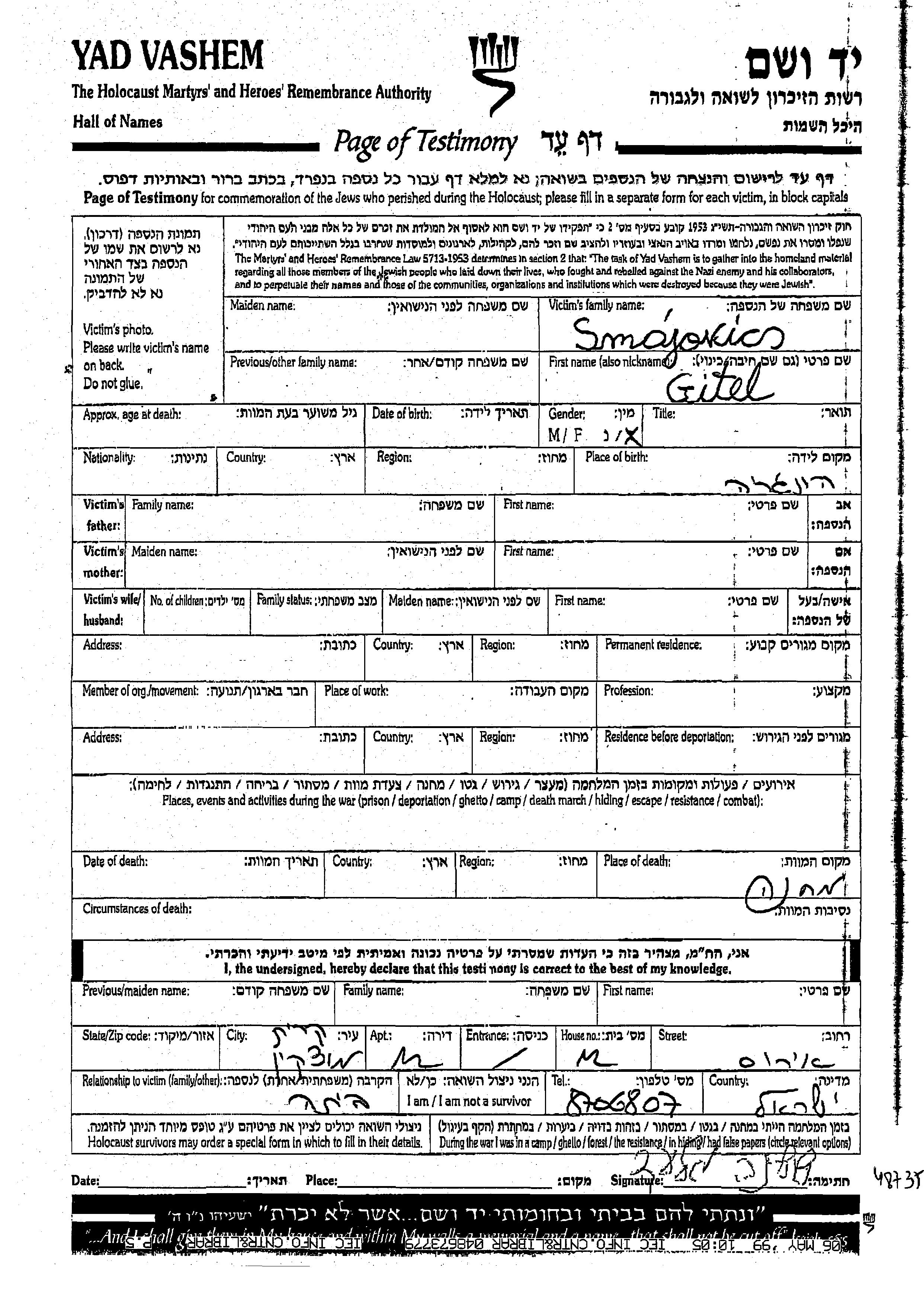 Shmaiovitz Gitel unbekannter Ort, Gedenkblatt