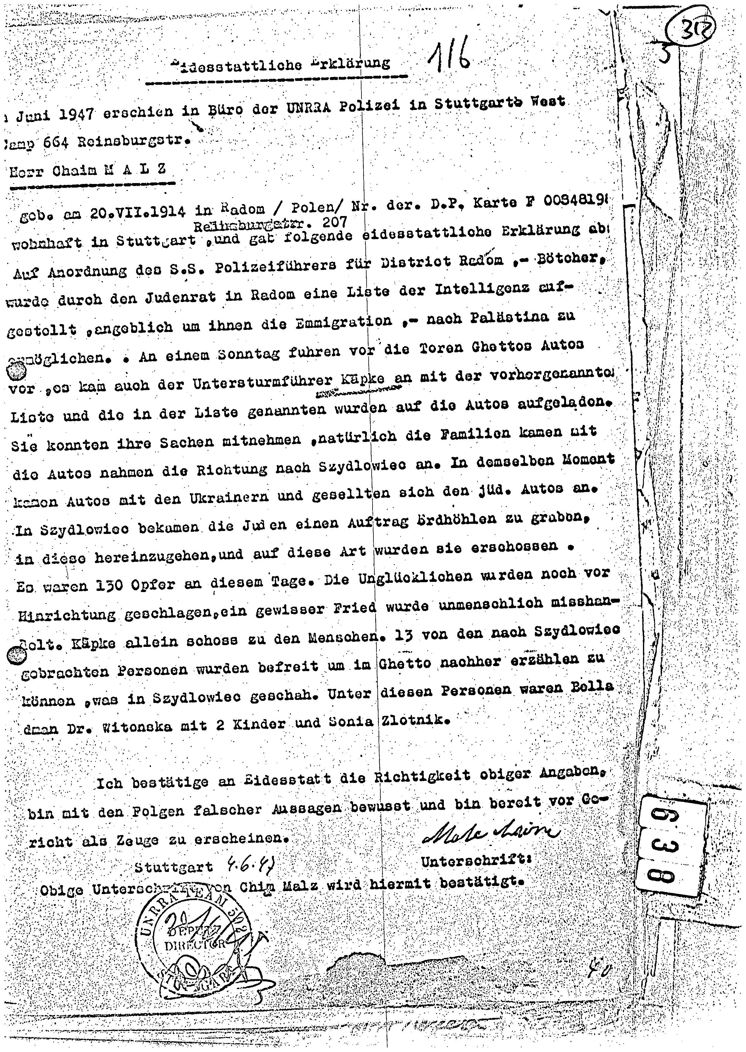 Postwar legal documentation regarding various Nazi war criminals, including testimonies and affidavits by survivors and eyewitnesses from Poland; documents dated, 1946-1949