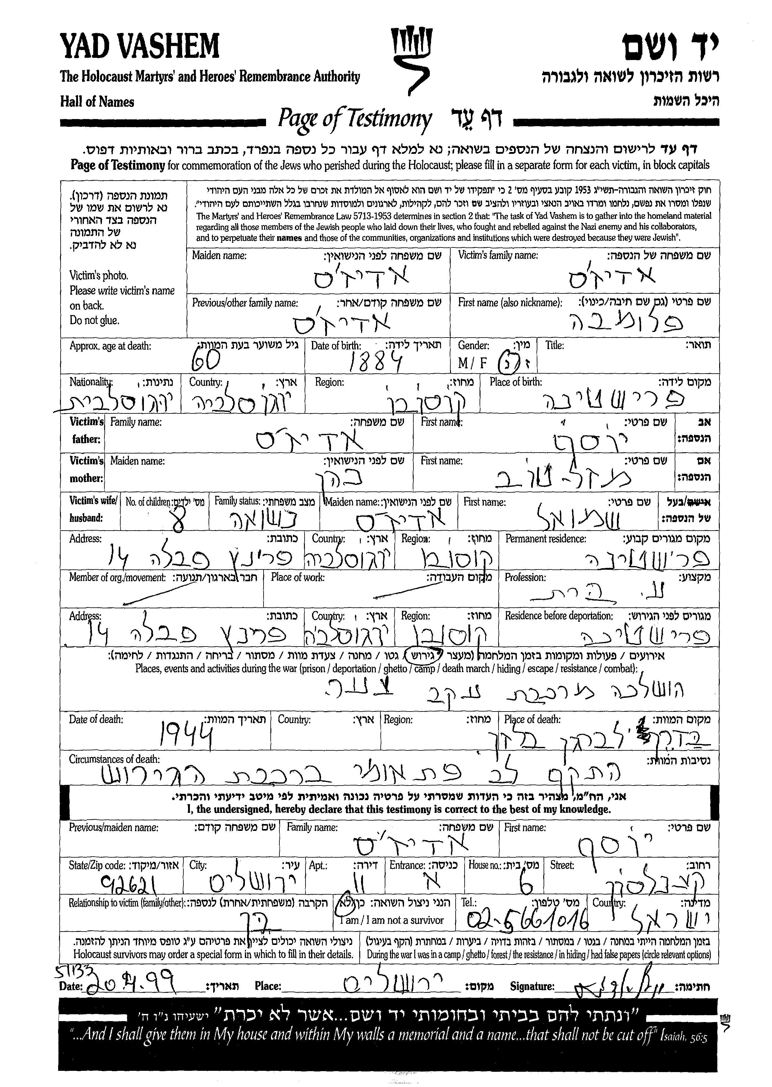 Palomba Adizhes, geb. Adizhes wurde im Jahr 1884 in Prishtina, Jugoslawien geboren. Sie war die Tochter von Yosef und Mazaltov. Sie war Hausfrau und mit Shmuel, geb. Adizhes Verheiratet. Vor dem Zweiten Weltkrieg lebte sie in Prishtina, Jugoslawien. Während des Krieges war sie in Prishtina, Jugoslawien.