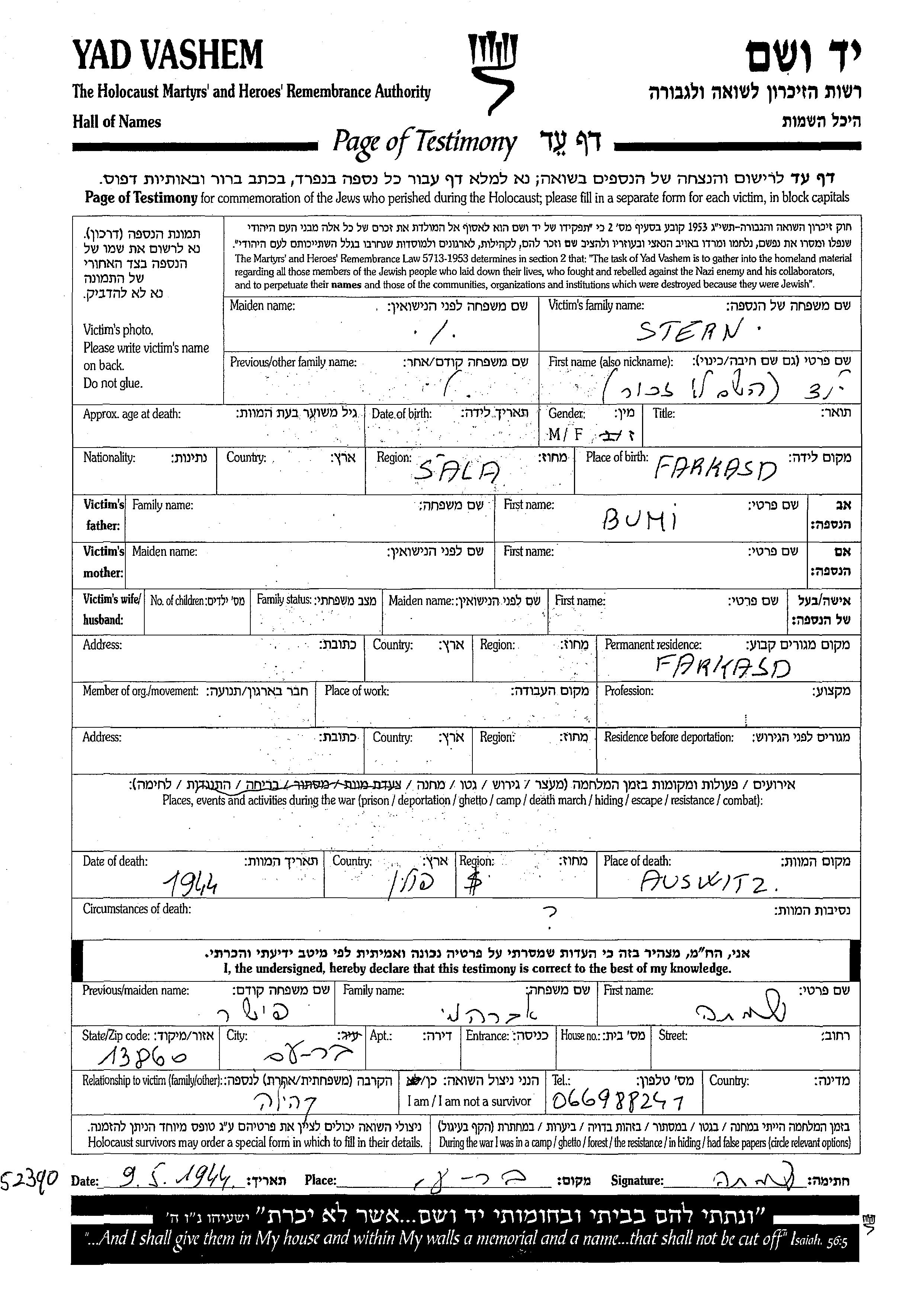 Vorname unbekannt Stern wurde in Farkasd, Tschechoslowakei geboren. Sie war die Tochter von Bumi. Sie war Kind. Vor dem Zweiten Weltkrieg lebte sie in Farkasd, Tschechoslowakei.