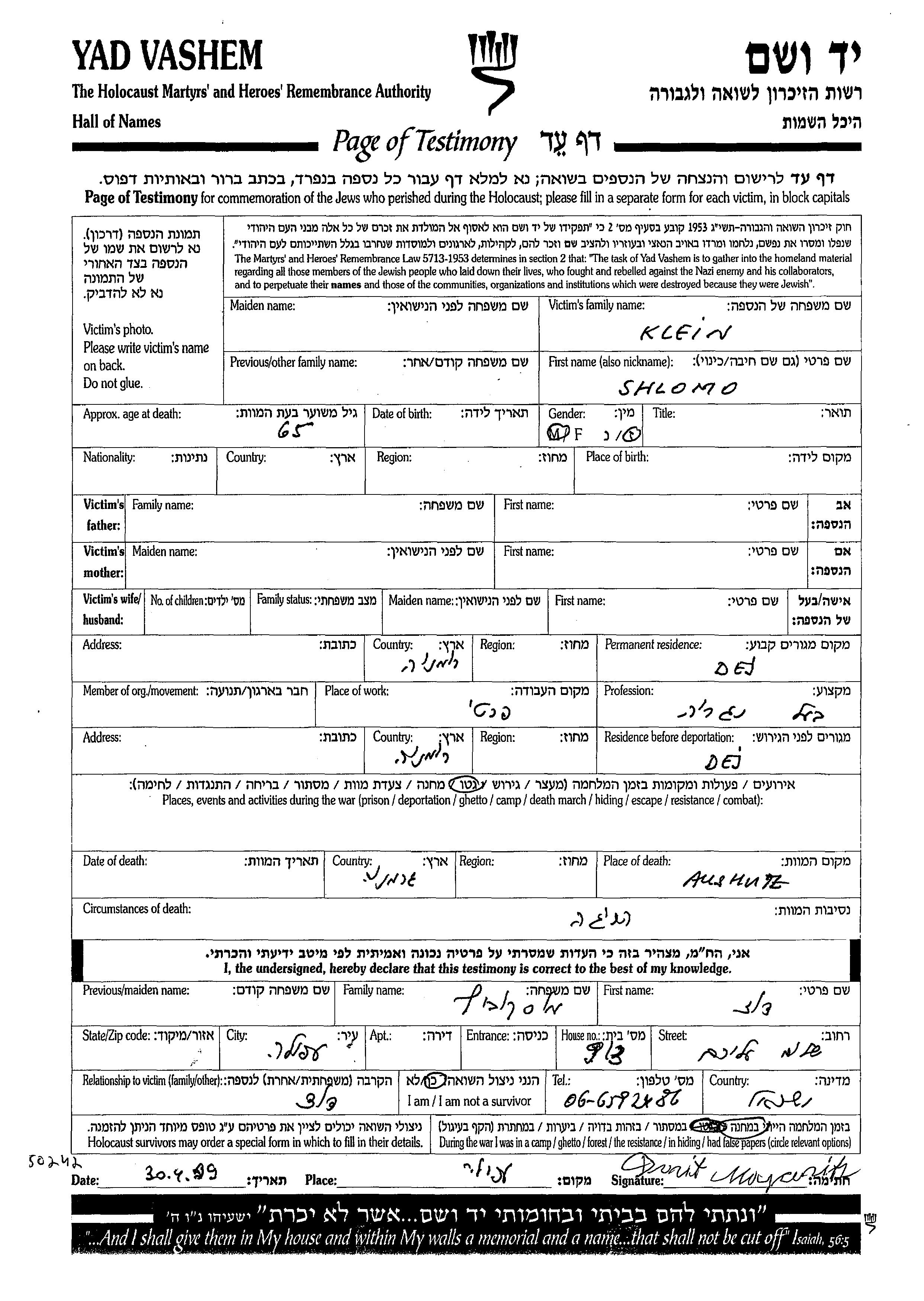 Shlomo Klein. Er war Tischlereibesitzer. Vor dem Zweiten Weltkrieg lebte er in Dej, Rumänien. Während des Krieges war er in Dej, Rumänien.