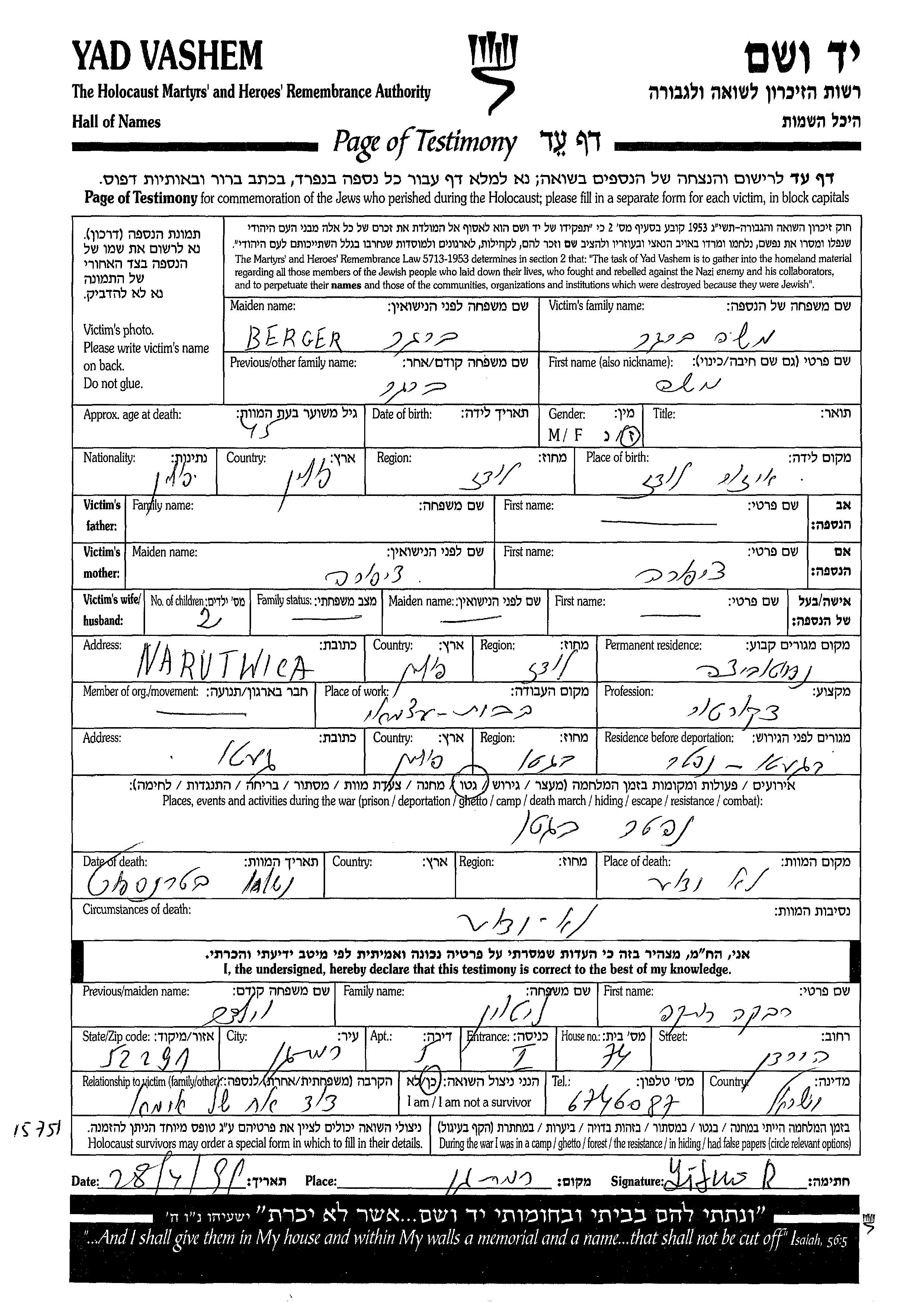 Moshe Berger wurde in Lodz, Polen geboren. Er war der Sohn von Tzipora. Er war Dekorateur und Verheiratet. Vor dem Zweiten Weltkrieg lebte er in Narutavichy, Polen. Während des Krieges war er in Polen.