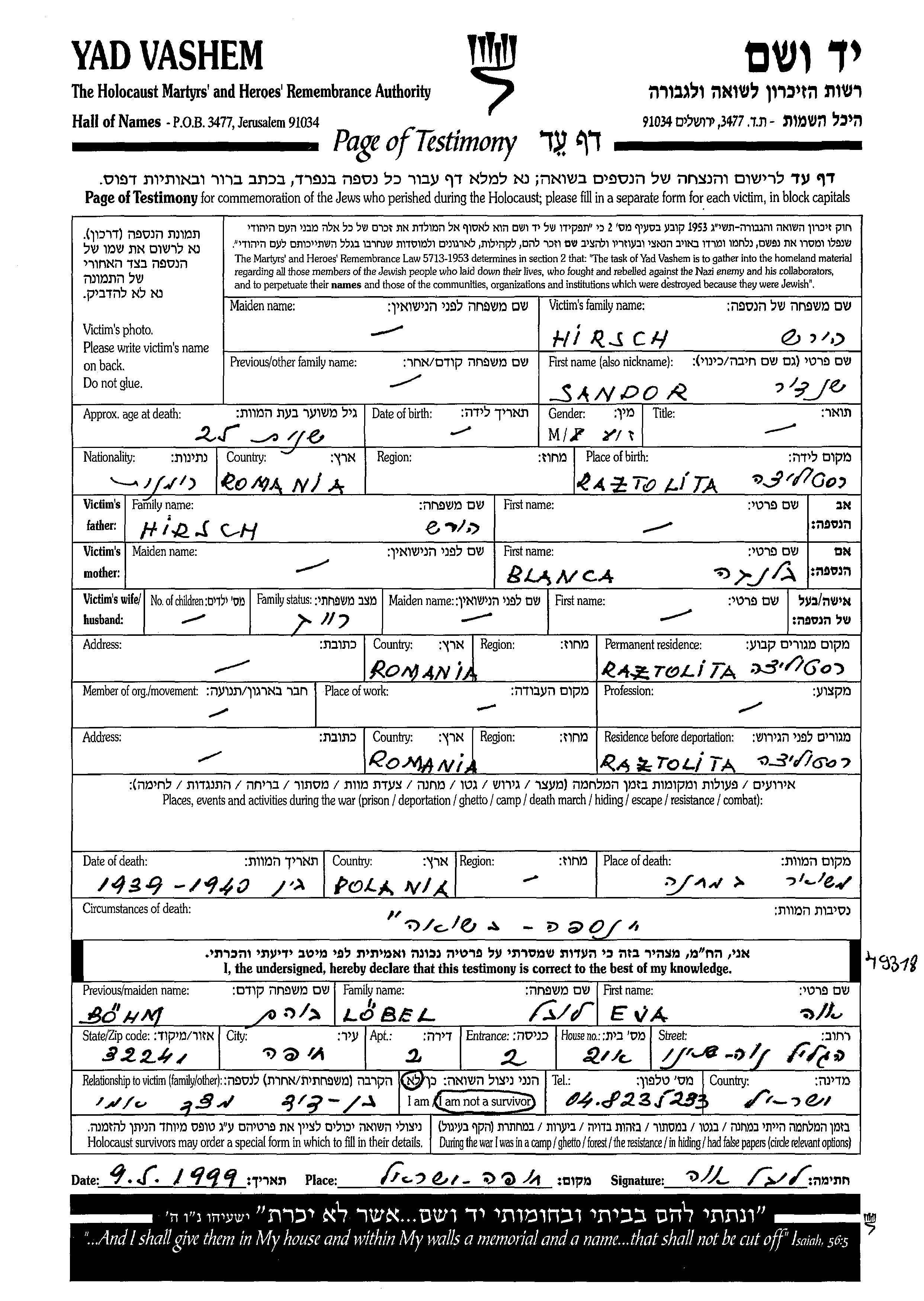 Sandor wurde in der Schoah ermordet. Todesort: Lager, Polen im Jahr 1939.