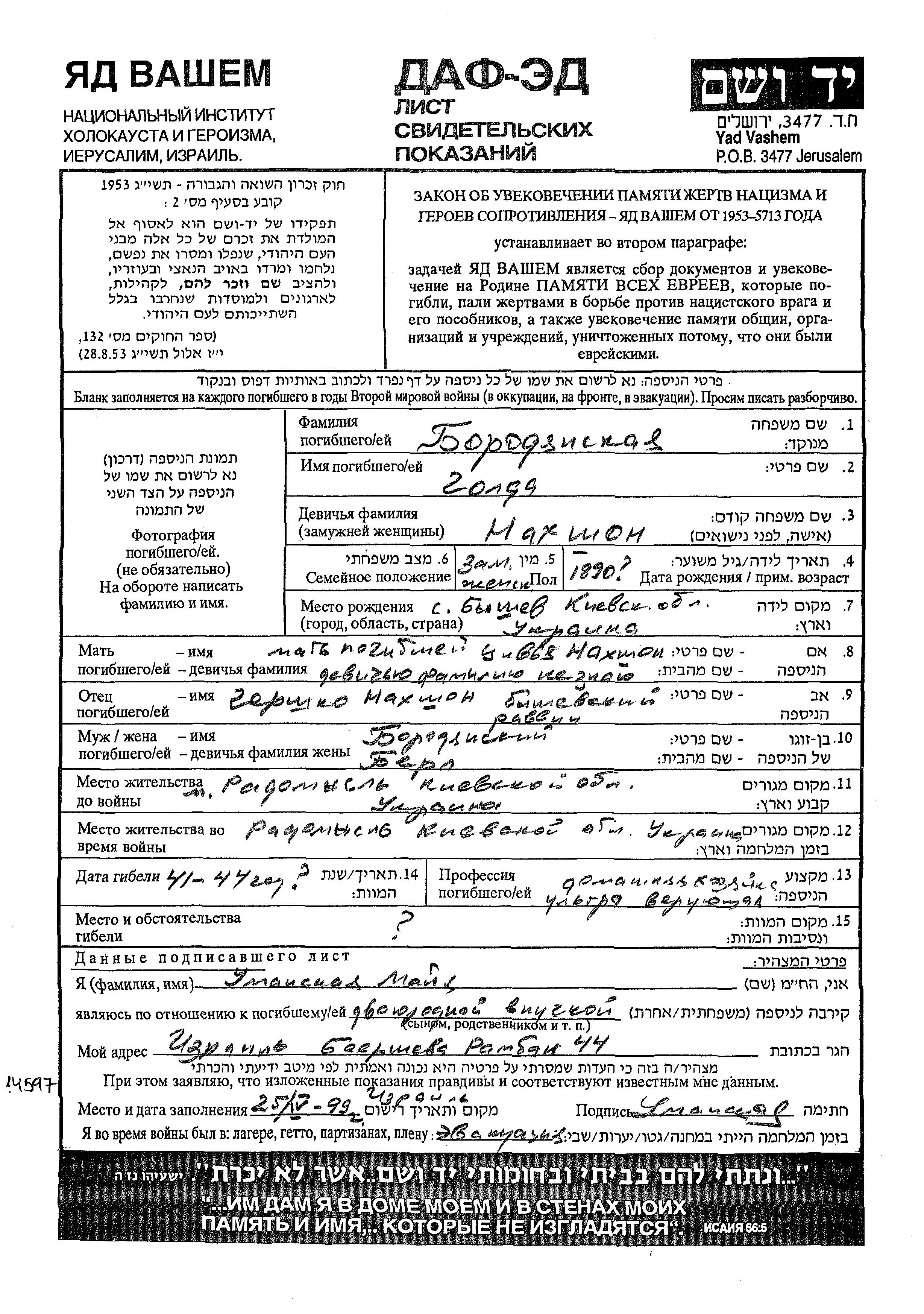 Golda Borodyanski, geb. Nakhshon wurde im Jahr 1890 in Byshev, Ukraine (UdSSR) geboren. Sie war die Tochter von Gershko und Tzivya. Sie war Hausfrau und mit Berl Verheiratet. Vor dem Zweiten Weltkrieg lebte sie in Radomysl, Ukraine (UdSSR). Während des Krieges war sie in Radomysl, Ukraine (UdSSR).
