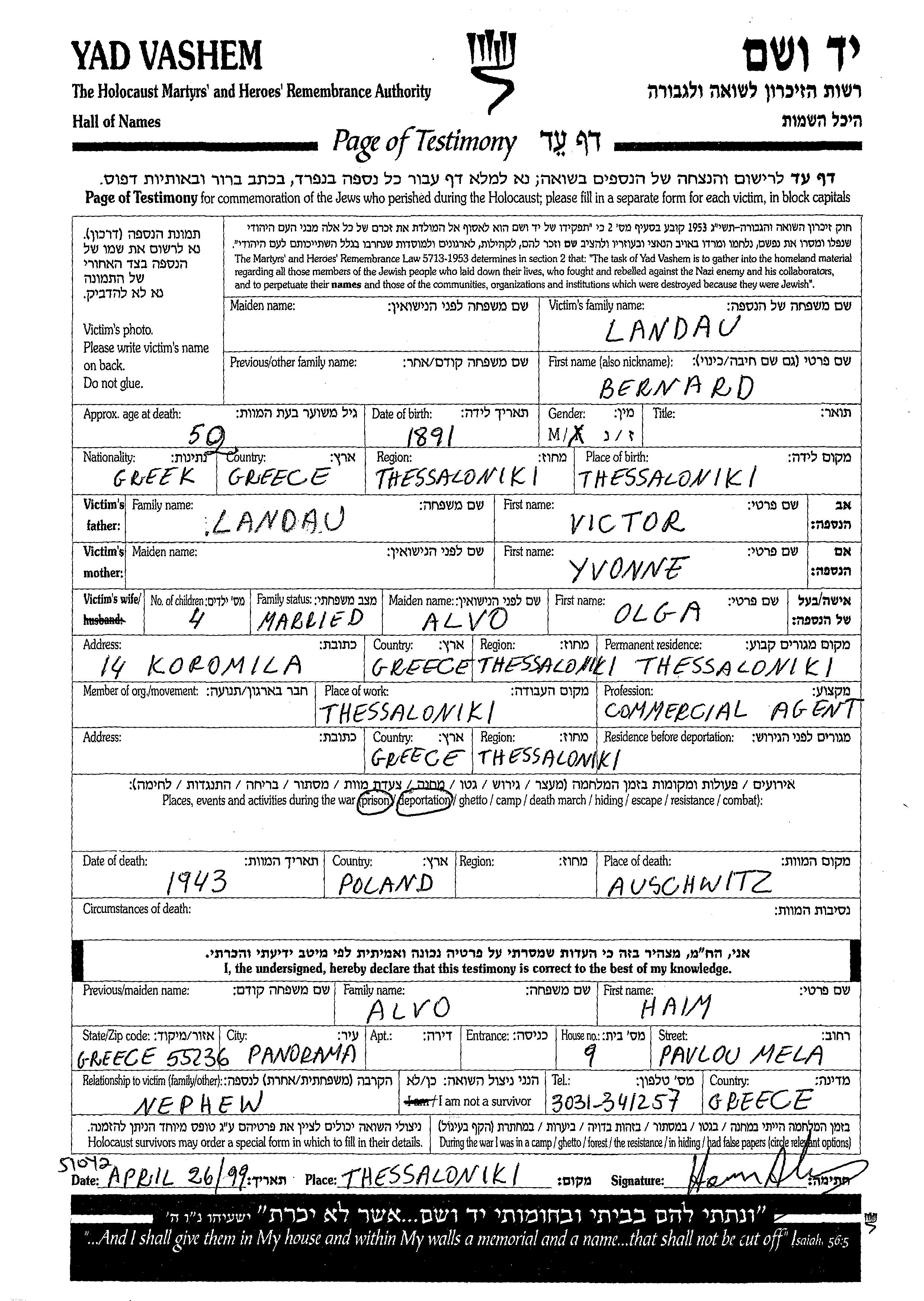 Bernard Landau wurde im Jahr 1891 in Thessaloniki, Griechenland geboren. Er war der Sohn von Victor und Yvonne. Er war Handelsvertreter und mit Olga, geb. Alvo Verheiratet. Vor dem Zweiten Weltkrieg lebte er in Thessaloniki, Griechenland. Während des Krieges war er in Thessaloniki, Griechenland.