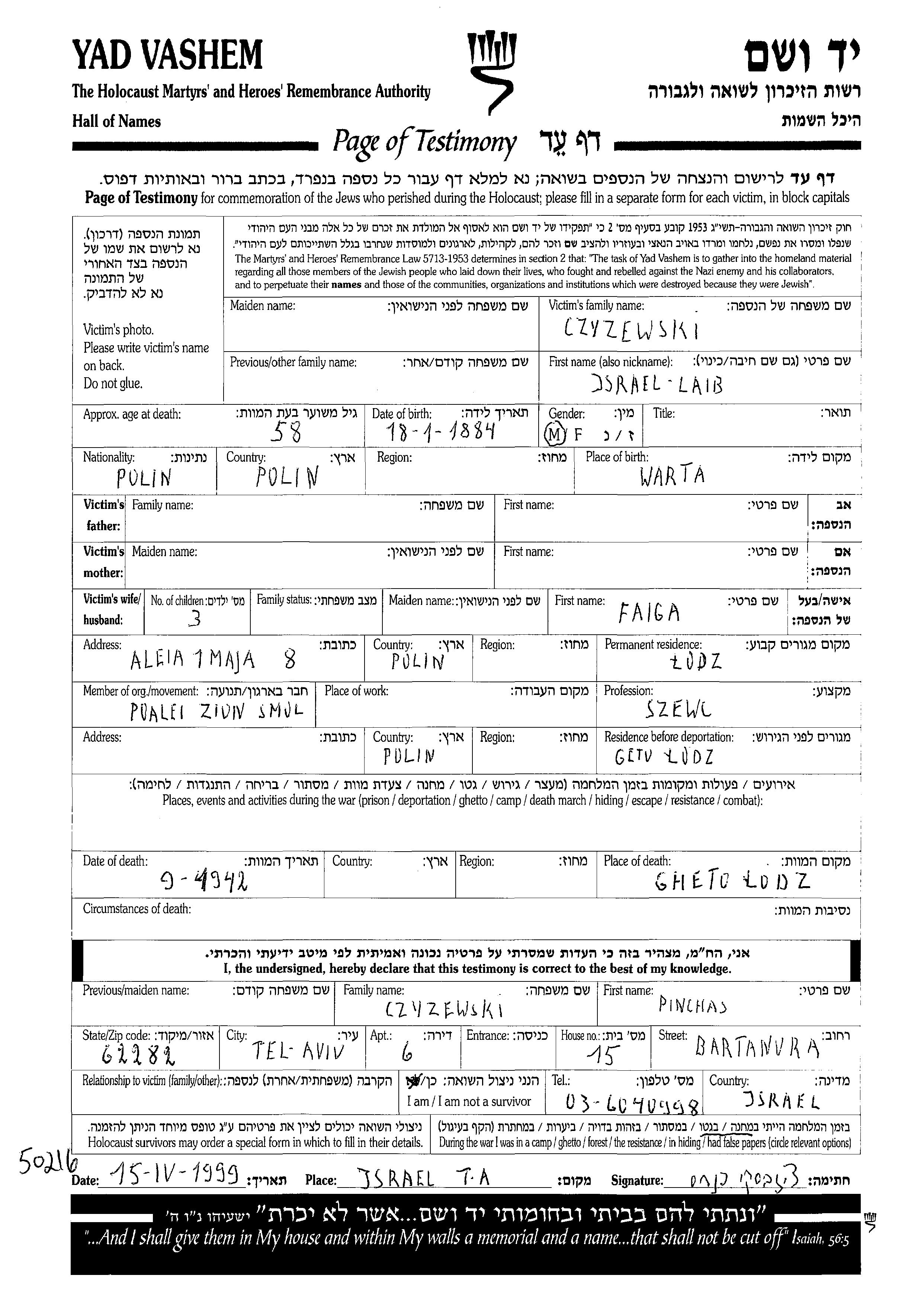 Israel Laib Czyzewski wurde im Jahr 1884 in Warta, Polen geboren. Er war Schuster/-in und mit Faiga Verheiratet. Vor dem Zweiten Weltkrieg lebte er in Lodz, Polen. Während des Krieges war er in Lodz, Polen.