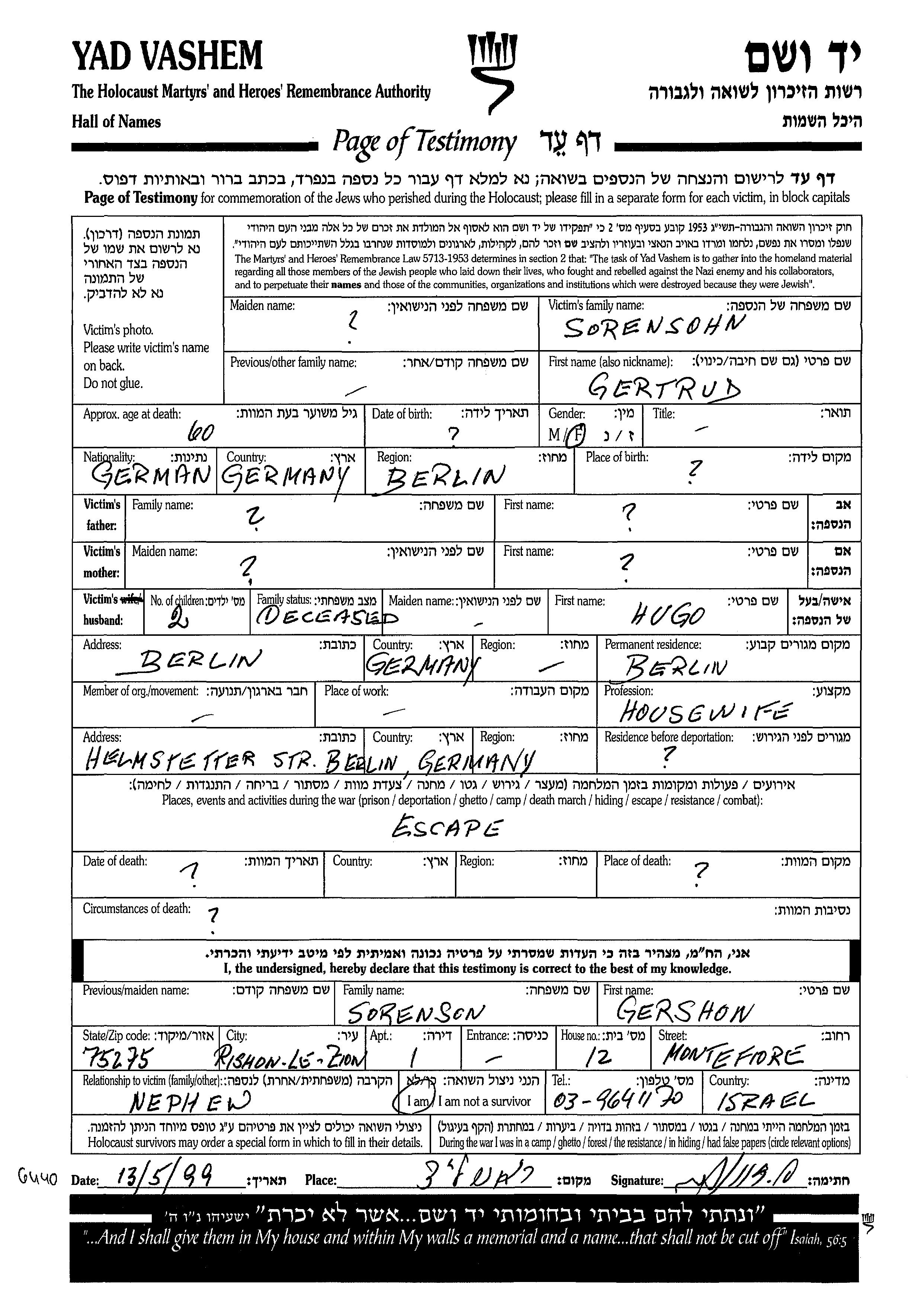 Gertrud Sorensohn wurde in Berlin, Deutsches Reich geboren. Sie war Hausfrau. Vor dem Zweiten Weltkrieg lebte sie in Berlin, Deutsches Reich. Während des Krieges war sie in Berlin, Deutsches Reich.