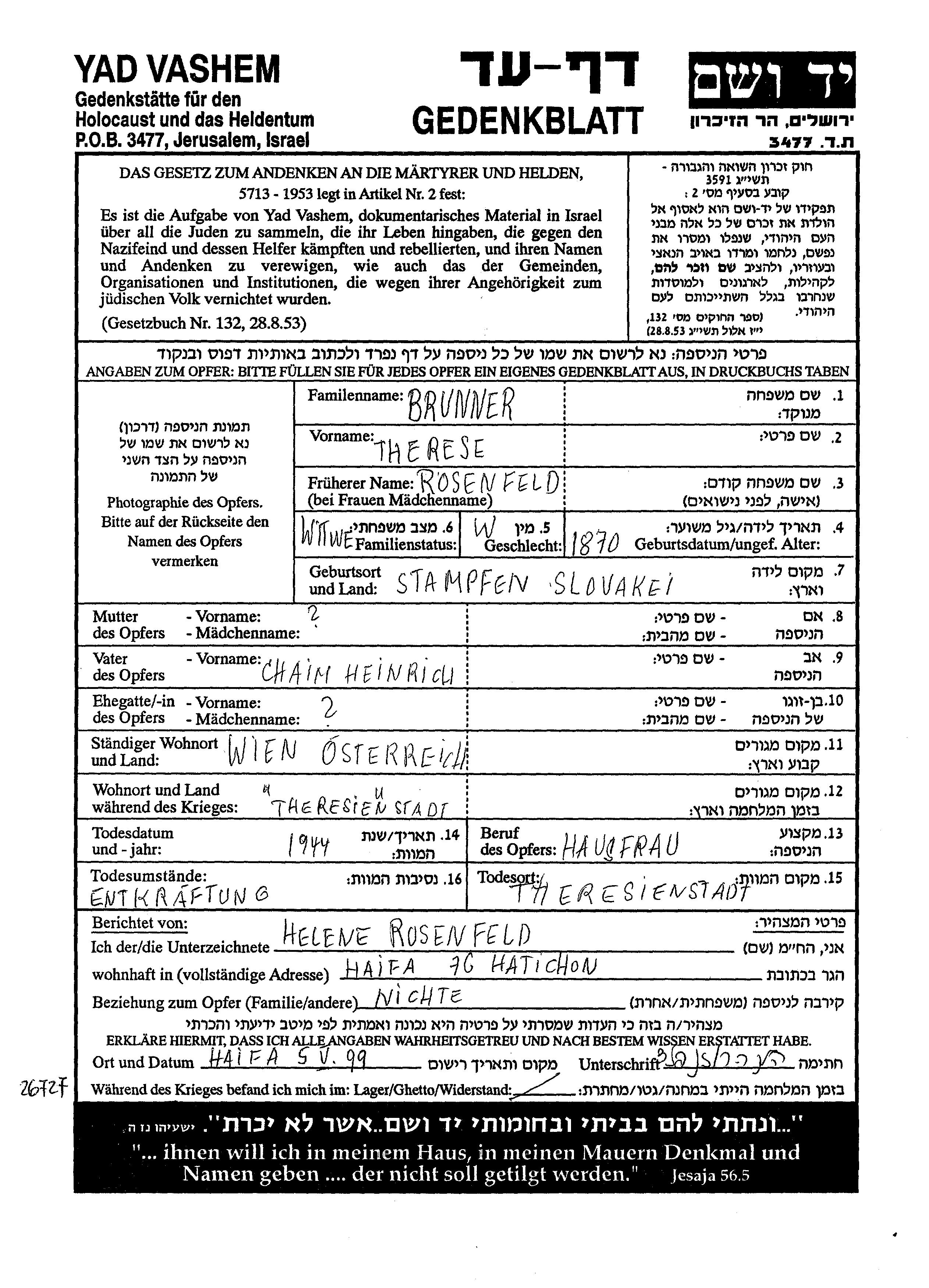 Therese Brunner, geb. Rosenfeld wurde im Jahr 1870 in Stampfen, Tschechoslowakei geboren. Sie war die Tochter von Chaim Heinrich. Sie war Witwe. Vor dem Zweiten Weltkrieg lebte sie in Wien, Österreich. Während des Krieges war sie in Theresienstadt, Tschechoslowakei.