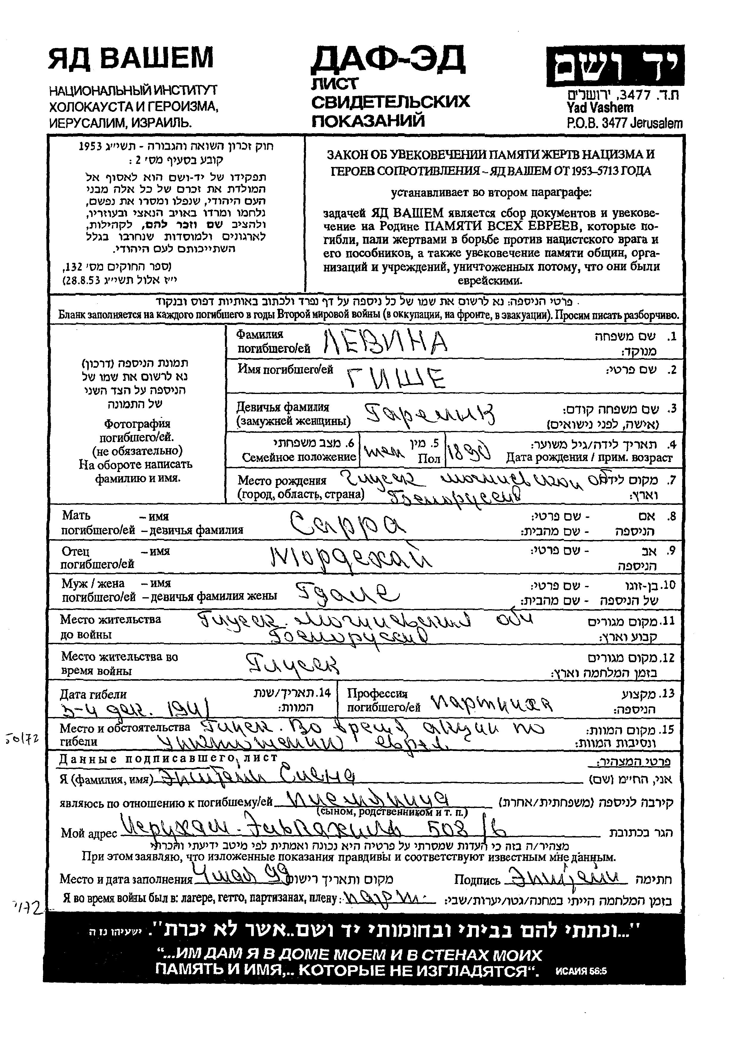 Gishe Levin, geb. Garelik wurde im Jahr 1890 in Glussk, Weißrussland (UdSSR) geboren. Sie war die Tochter von Mordekhai und Sarra. Sie war Schneiderin. Vor dem Zweiten Weltkrieg lebte sie in Glussk, Weißrussland (UdSSR). Während des Krieges war sie in Glussk, Weißrussland (UdSSR).