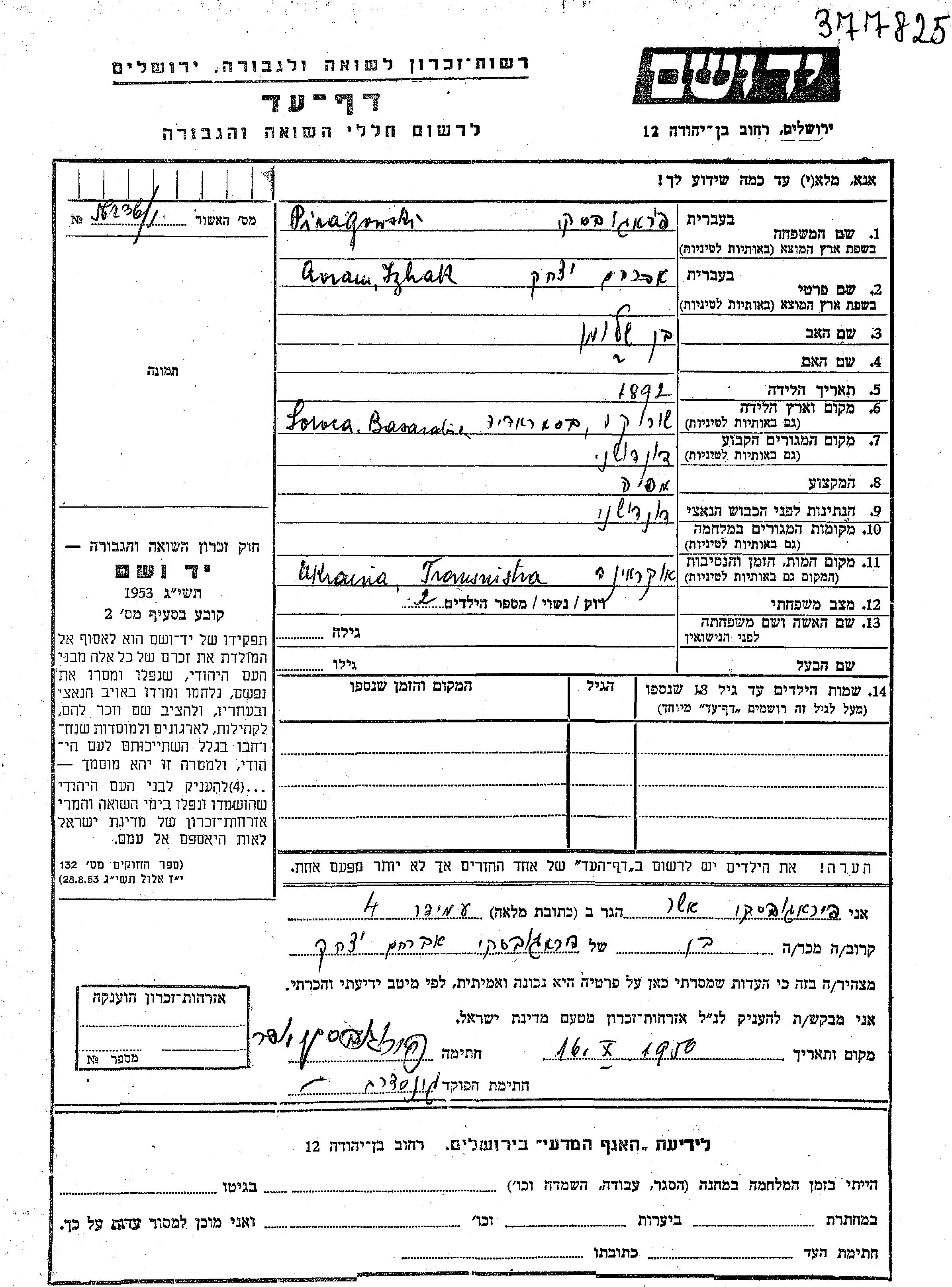 Avram Izhak wurde in der Schoah ermordet. Todesort: Transnistria, Ukraine (UdSSR).