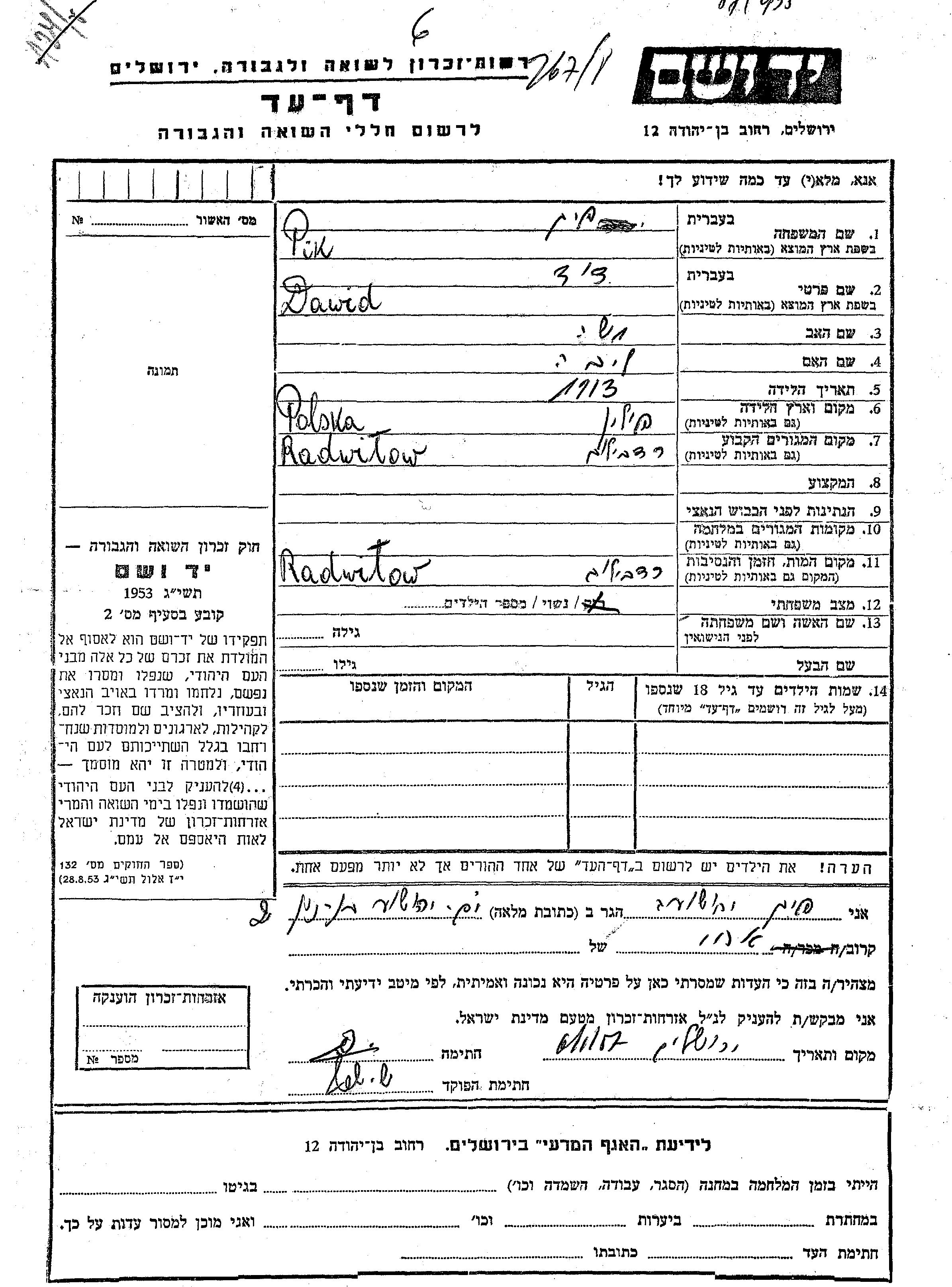 Dawid wurde in der Schoah ermordet. Todesort: Radwilow, Polen.