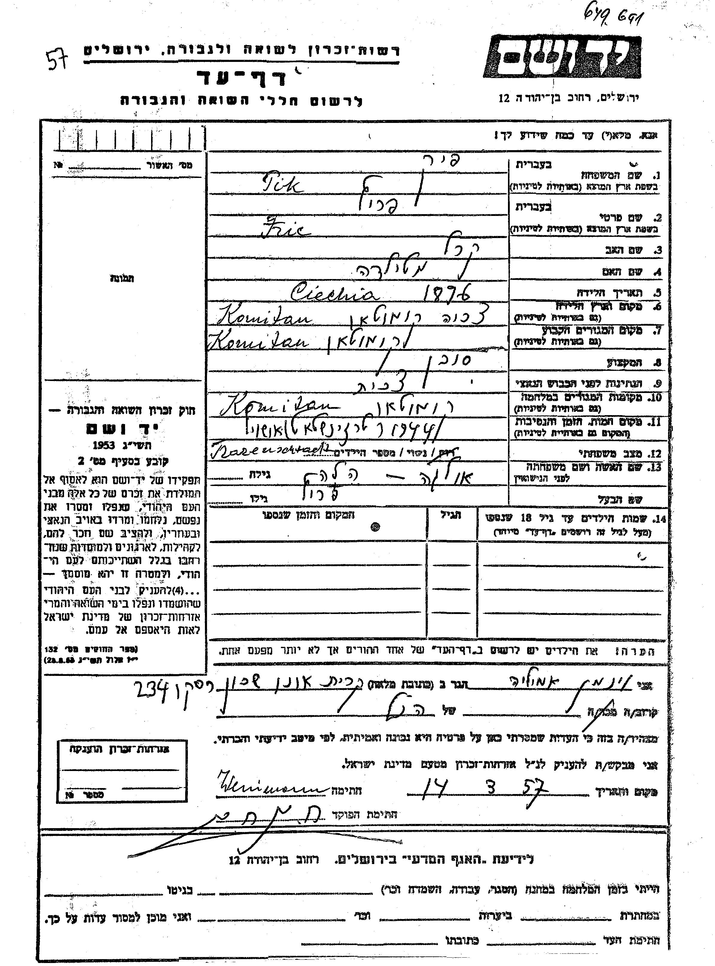 Fric Pik wurde im Jahr 1876 in Komiaty, Tschechoslowakei geboren. Er war der Sohn von Karl und Matilda. Er war Vertreter/-in und mit Olga Verheiratet. Vor dem Zweiten Weltkrieg lebte er in Komiaty, Tschechoslowakei. Während des Krieges war er in Komiaty, Tschechoslowakei.