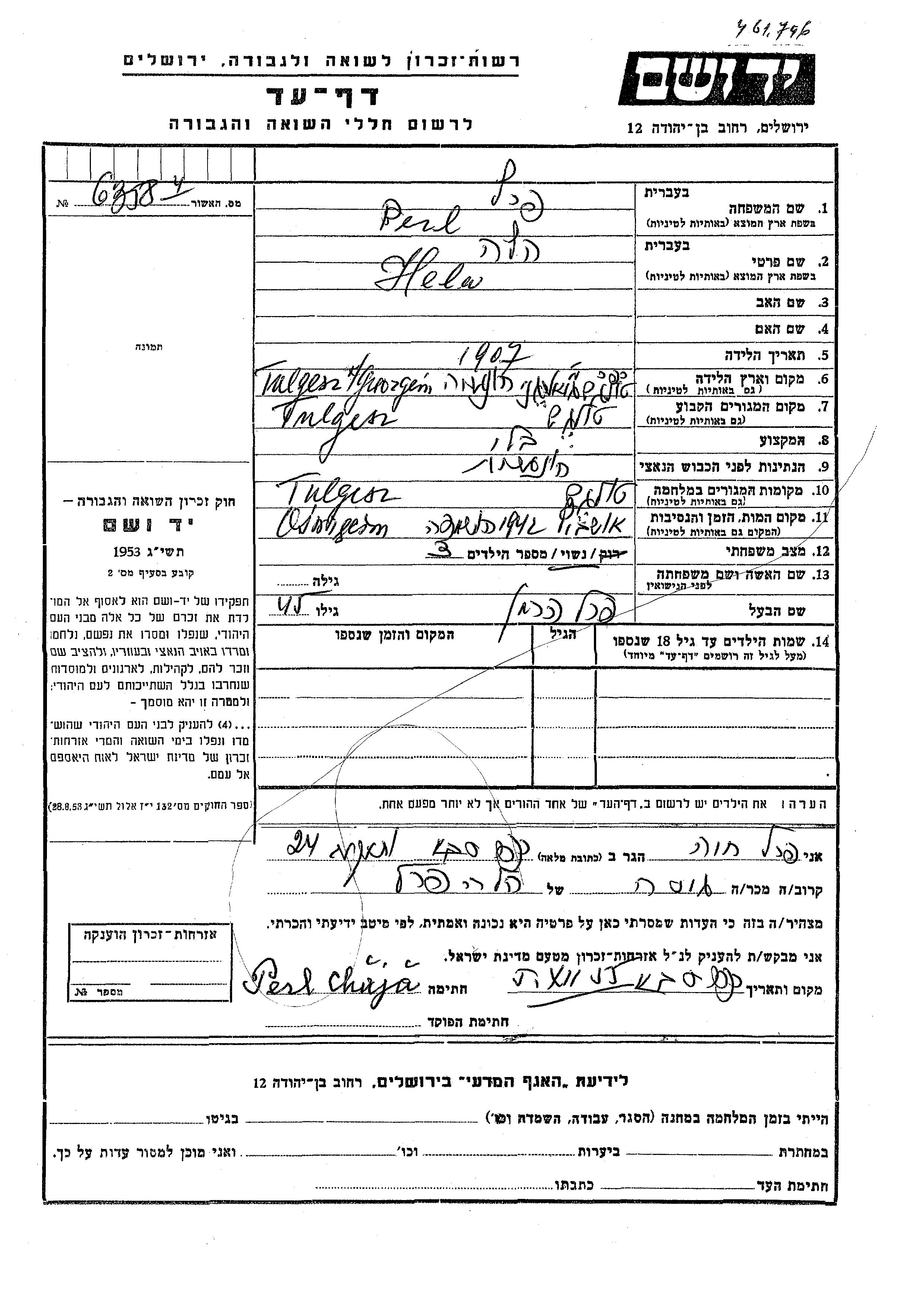 Hela Perl wurde im Jahr 1907 in Tulghes, Rumänien geboren. Sie war mit Herman Verheiratet. Vor dem Zweiten Weltkrieg lebte sie in Tulghes, Rumänien. Während des Krieges war sie in Tulghes, Rumänien.