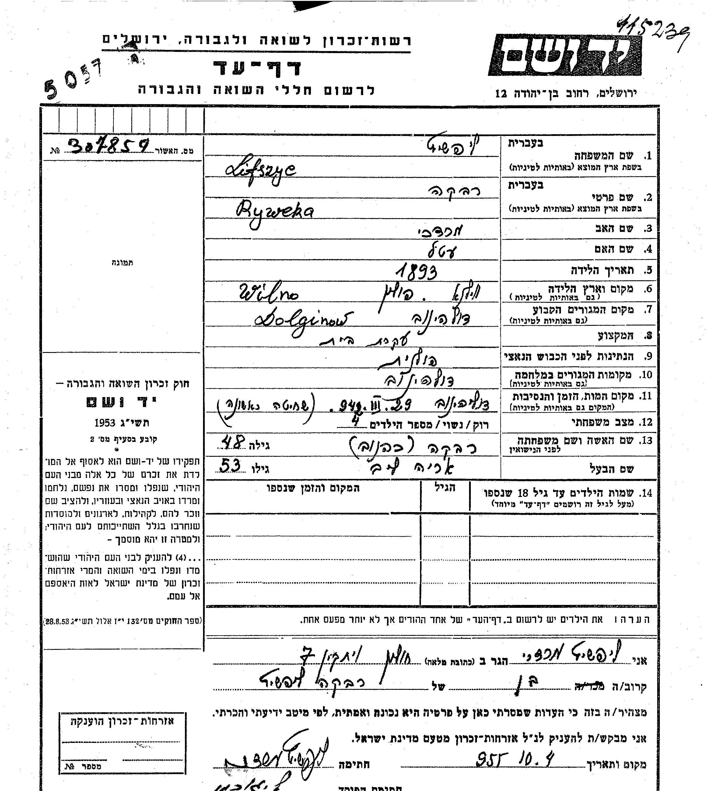 Ryweka Lifszyc, geb. Kahanov wurde im Jahr 1893 in Wilno, Polen geboren. Sie war die Tochter von Mordekhai und Etel. Sie war Hausfrau und mit Arie Leib Verheiratet. Vor dem Zweiten Weltkrieg lebte sie in Dolginov, Polen. Während des Krieges war sie in Dolginov, Polen.