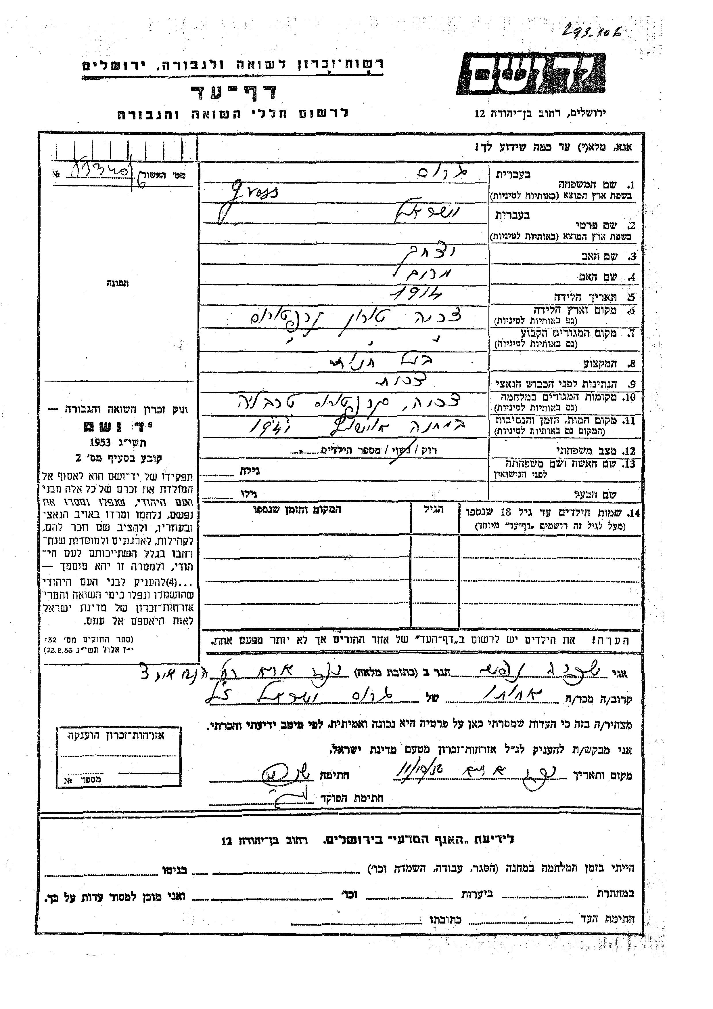 Yisrael Gross wurde im Jahr 1914 in Toron, Tschechoslowakei geboren. Er war der Sohn von Yitzkhak und Miriam. Er war Ladenbesitzer/-in und Ledig. Vor dem Zweiten Weltkrieg lebte er in Toron, Tschechoslowakei. Während des Krieges war er in Tereblia, Tschechoslowakei.