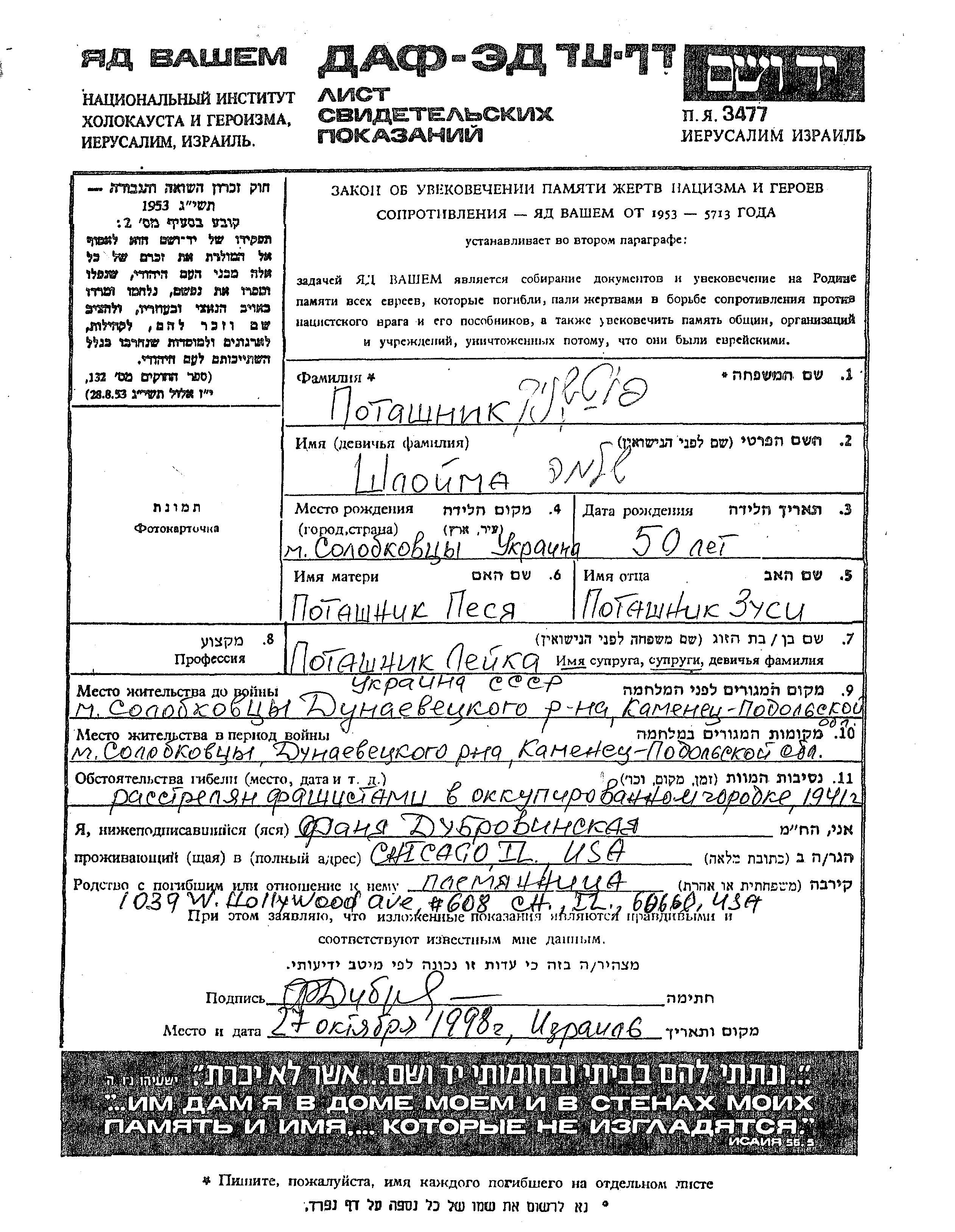 Potashnik Shloima Solobkovtsy, Ukraine (UdSSR) Gedenkblatt