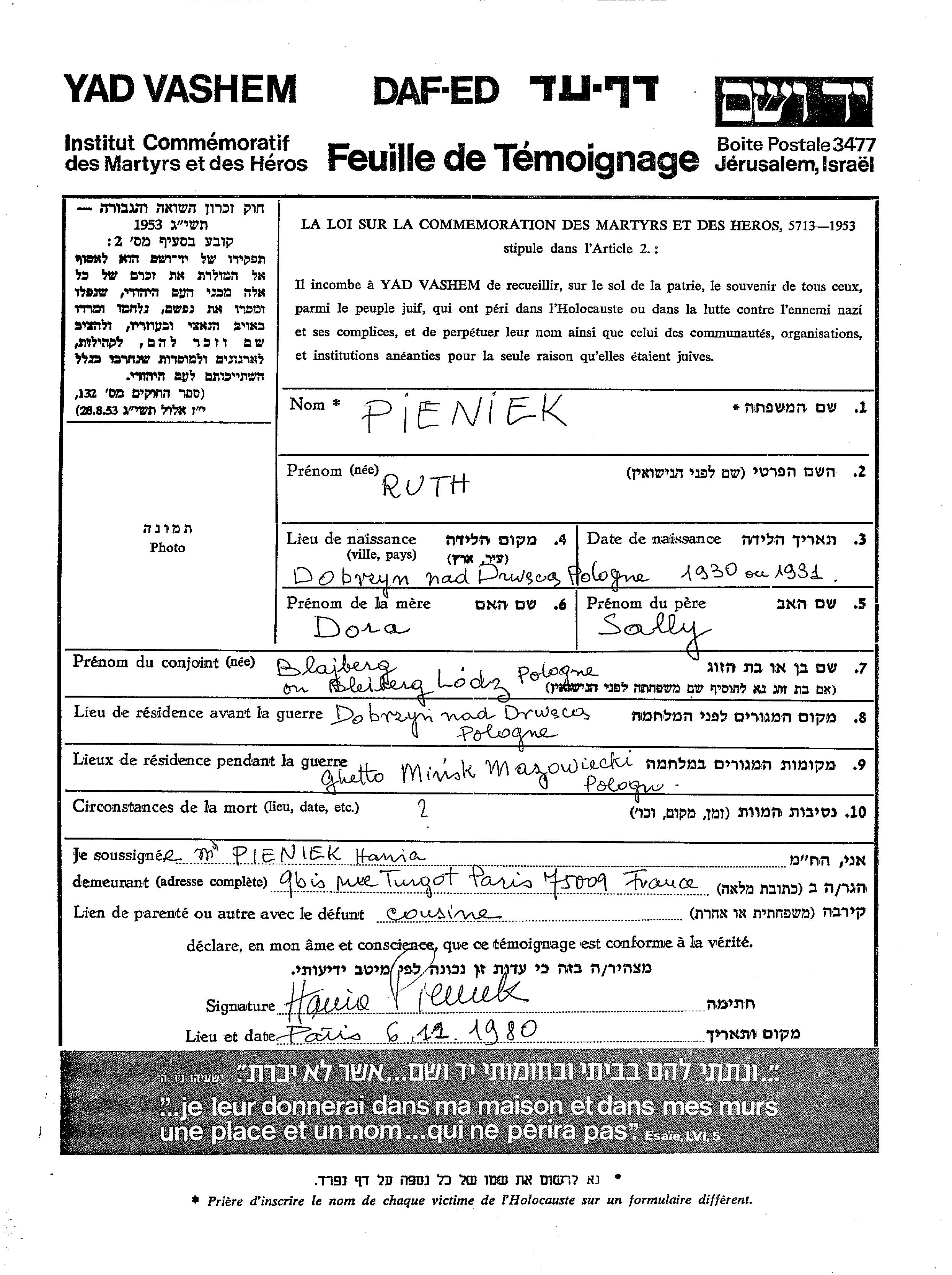 Ruth Pieniek wurde im Jahr 1930 in Dobrzyn nad Drweca, Polen geboren. Sie war die Tochter von Sally und Dora. Sie war Ledig. Vor dem Zweiten Weltkrieg lebte sie in Dobrzyn nad Drweca, Polen. Während des Krieges war sie in Minsk Mazowiecki, Polen.