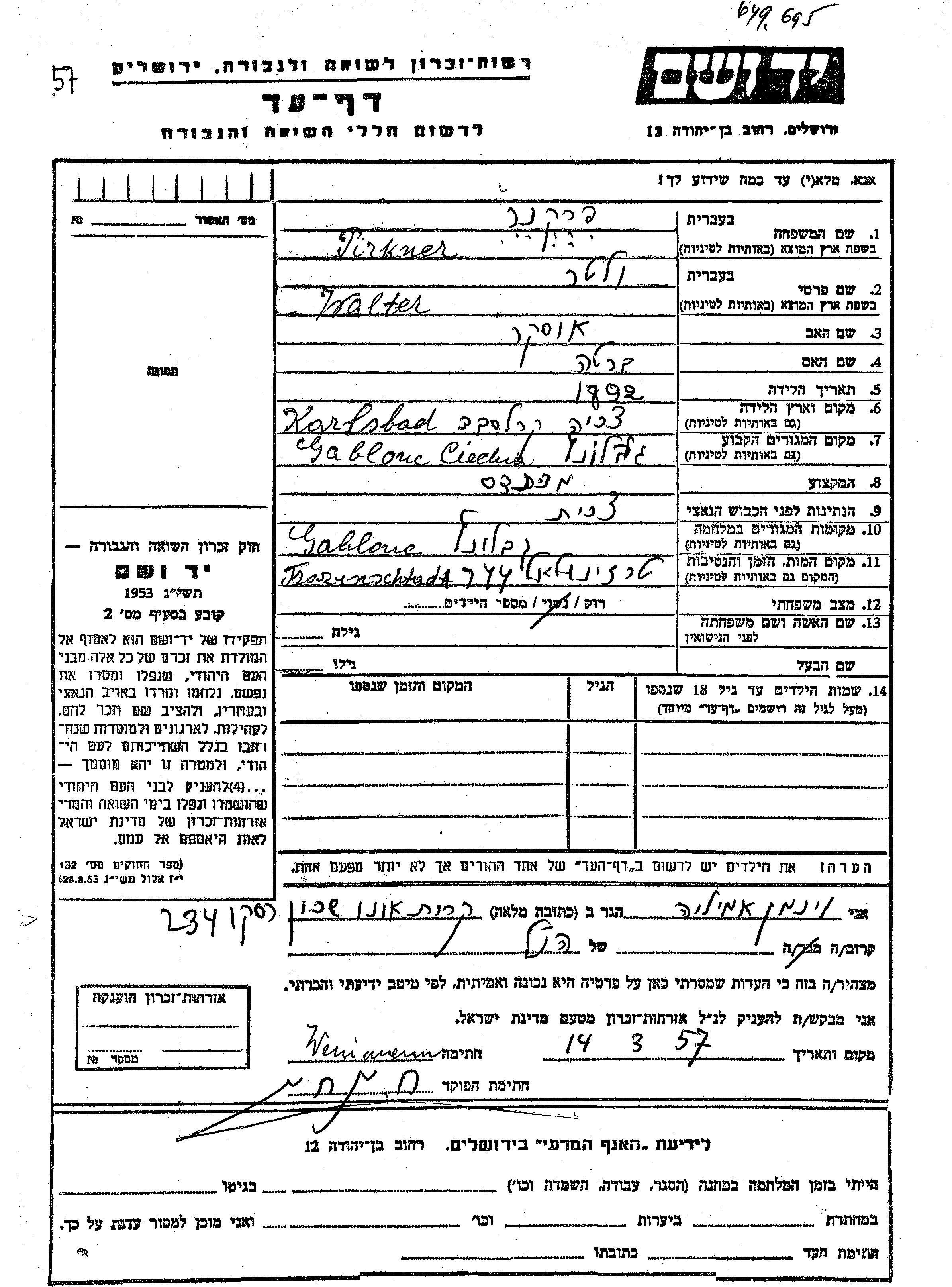 Walter Pirkner wurde im Jahr 1892 in Karlsbad, Tschechoslowakei geboren. Er war der Sohn von Oskar und Berta. Er war Ingenieur und Ledig. Vor dem Zweiten Weltkrieg lebte er in Jablonec, Tschechoslowakei. Während des Krieges war er in Jablonec, Tschechoslowakei.