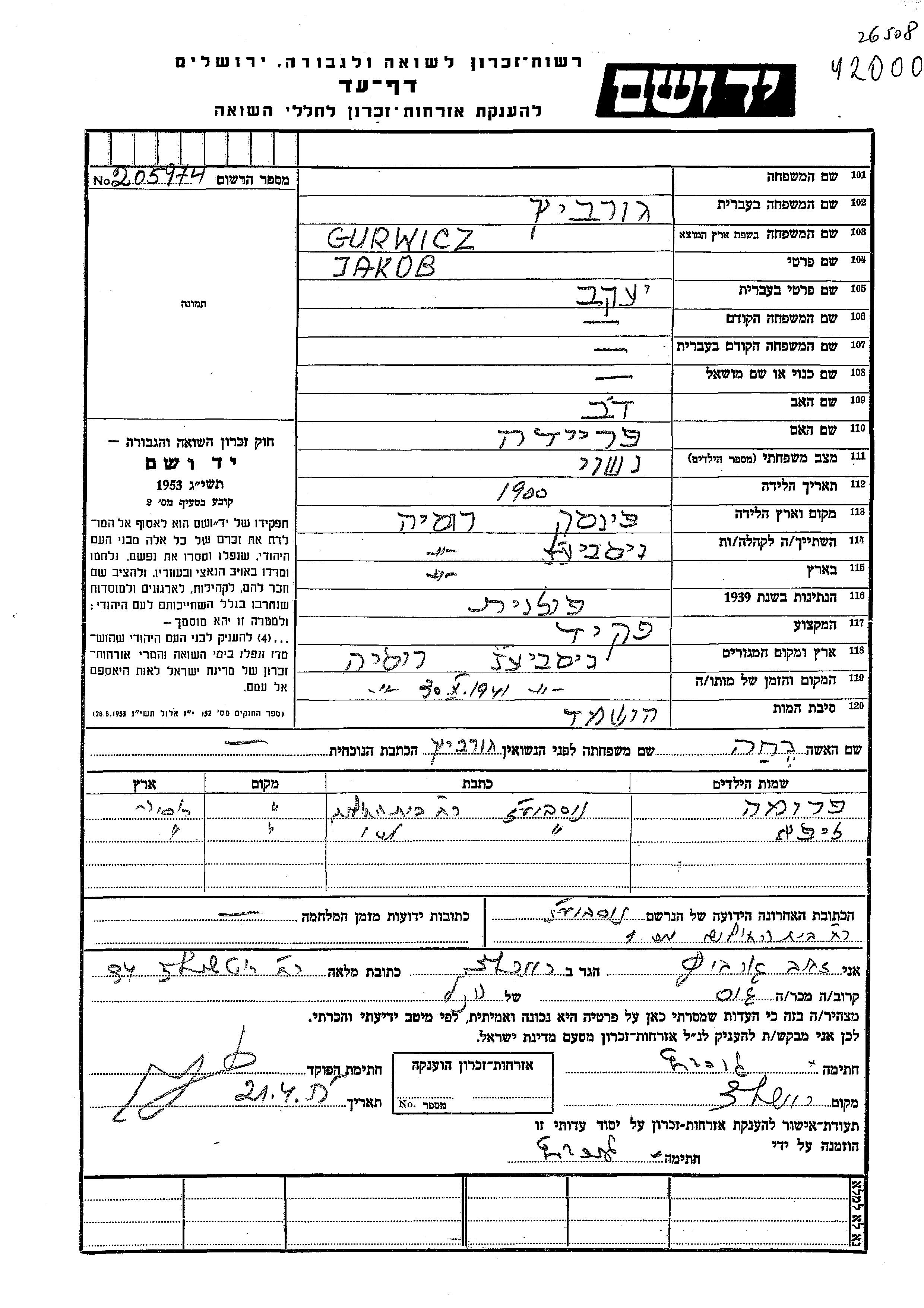 Jakob Gurwicz wurde im Jahr 1900 in Pinsk, Polen geboren. Er war der Sohn von Dov und Freida. Er war Angestellte/-r und mit Nekha Verheiratet. Vor dem Zweiten Weltkrieg lebte er in Nieswierz, Polen. Während des Krieges war er in Nieswierz, Polen.