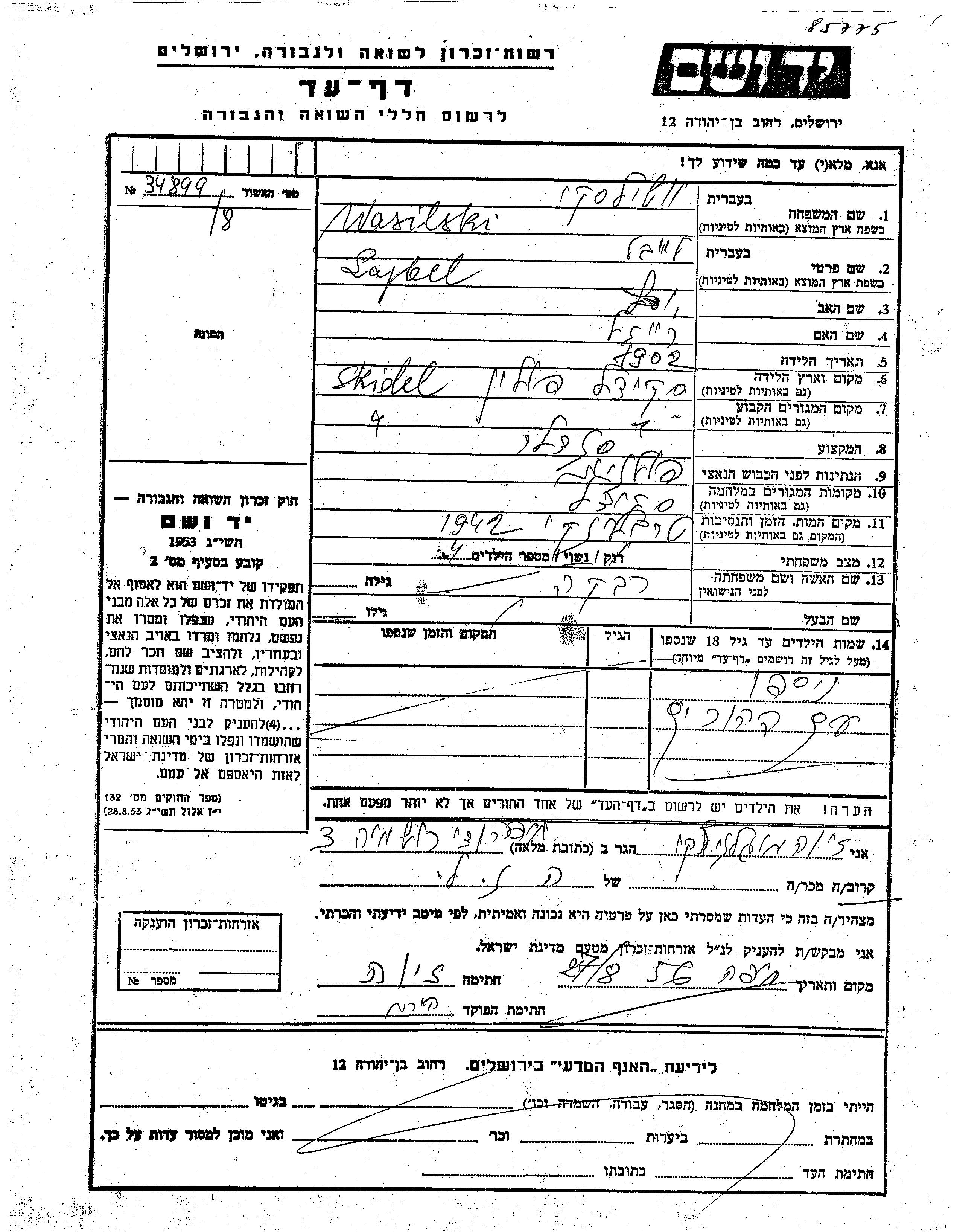 Lajbel Wasilski wurde im Jahr 1902 in Skidel, Polen geboren. Er war der Sohn von Yosef und Reizl. Er war Schuster/-in und mit Rivka Verheiratet. Vor dem Zweiten Weltkrieg lebte er in Skidel, Polen. Während des Krieges war er in Skidel, Polen.