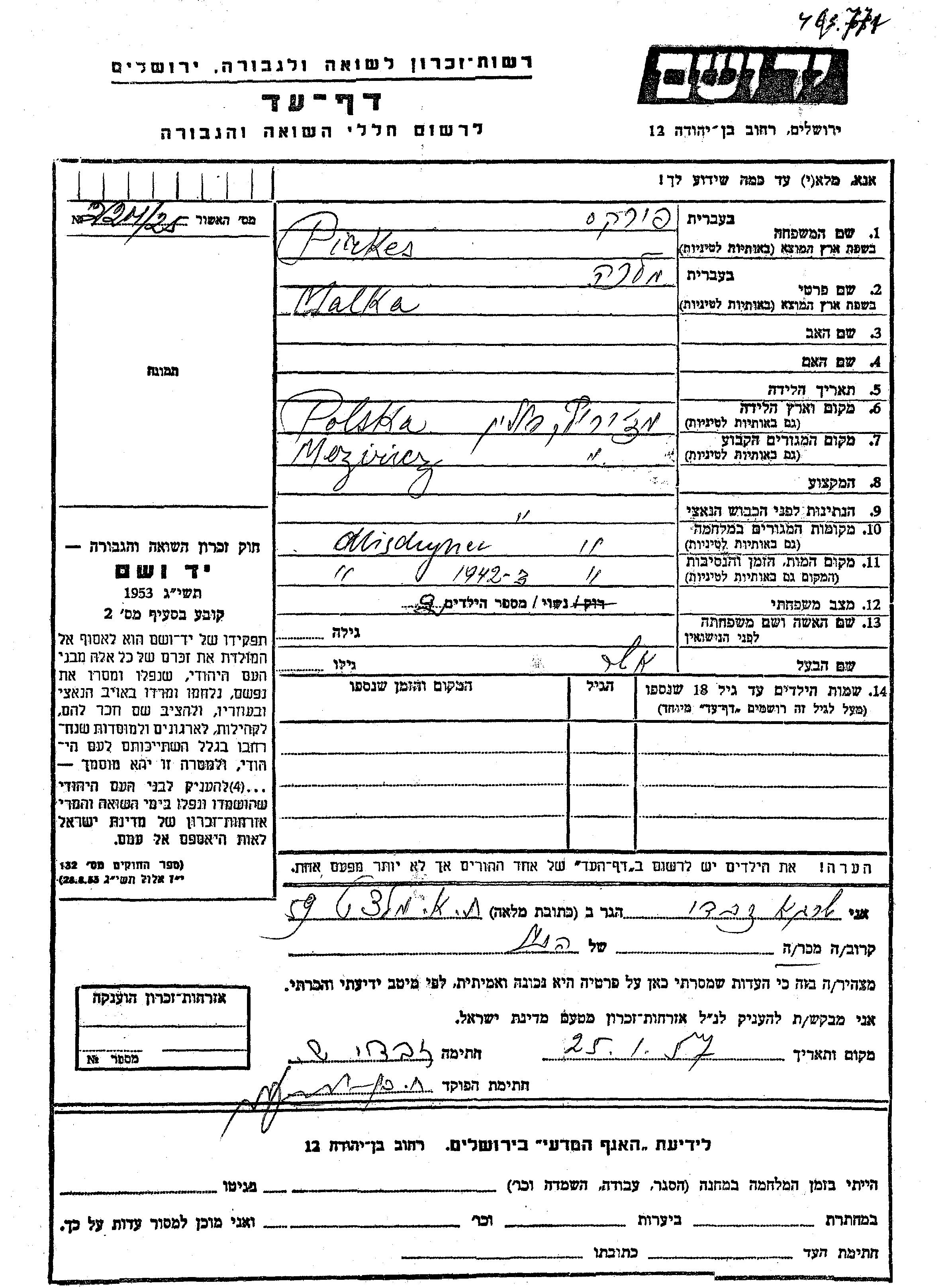 Malka wurde in der Schoah ermordet. Todesort: Mezerich, Polen im Jahr 1942.