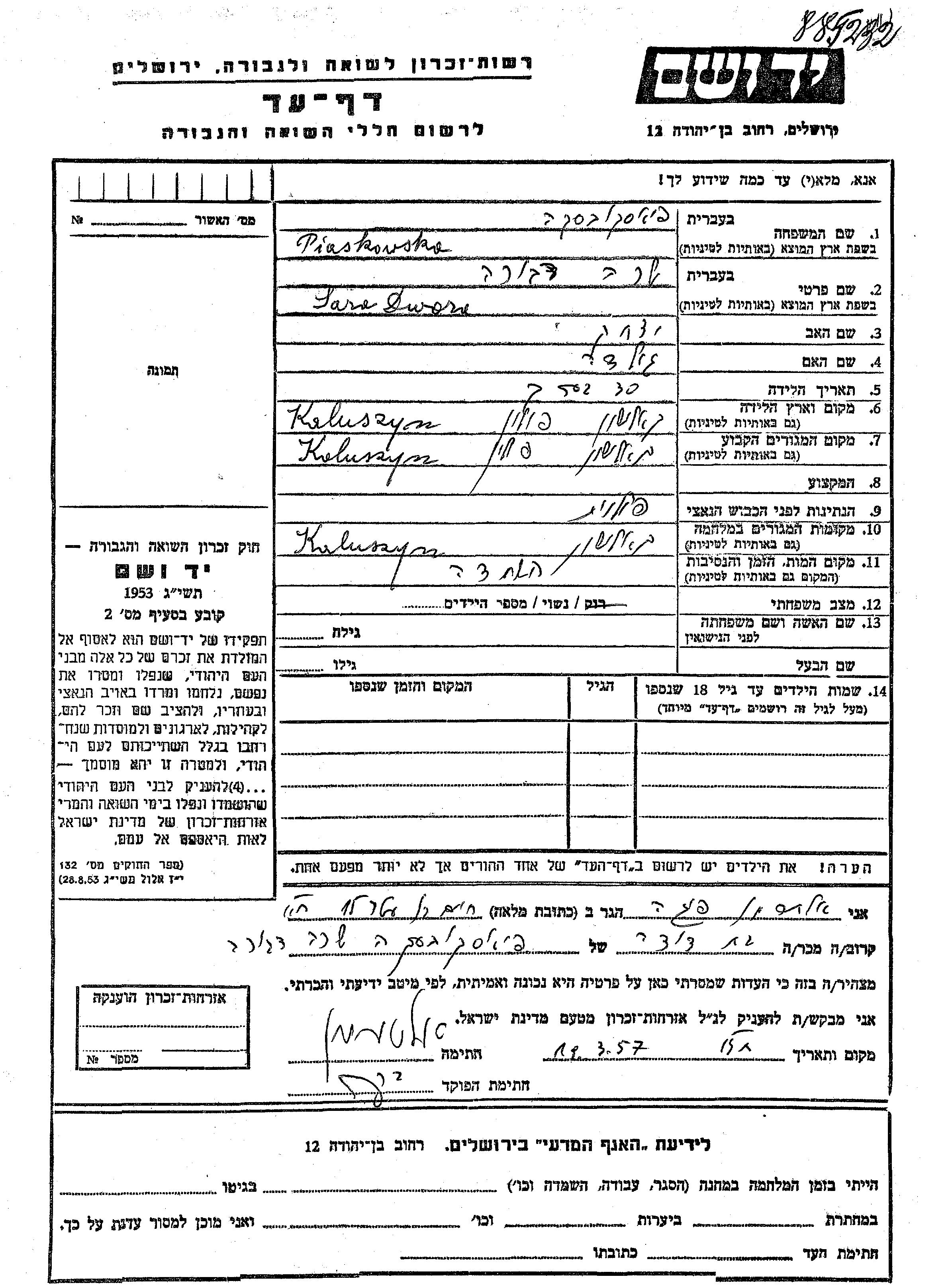 Dwora Sara Piaskowska wurde in Kaluszyn, Polen geboren. Sie war die Tochter von Yitzkhak und Golda. Sie war Verheiratet. Vor dem Zweiten Weltkrieg lebte sie in Kaluszyn, Polen. Während des Krieges war sie in Kaluszyn, Polen.