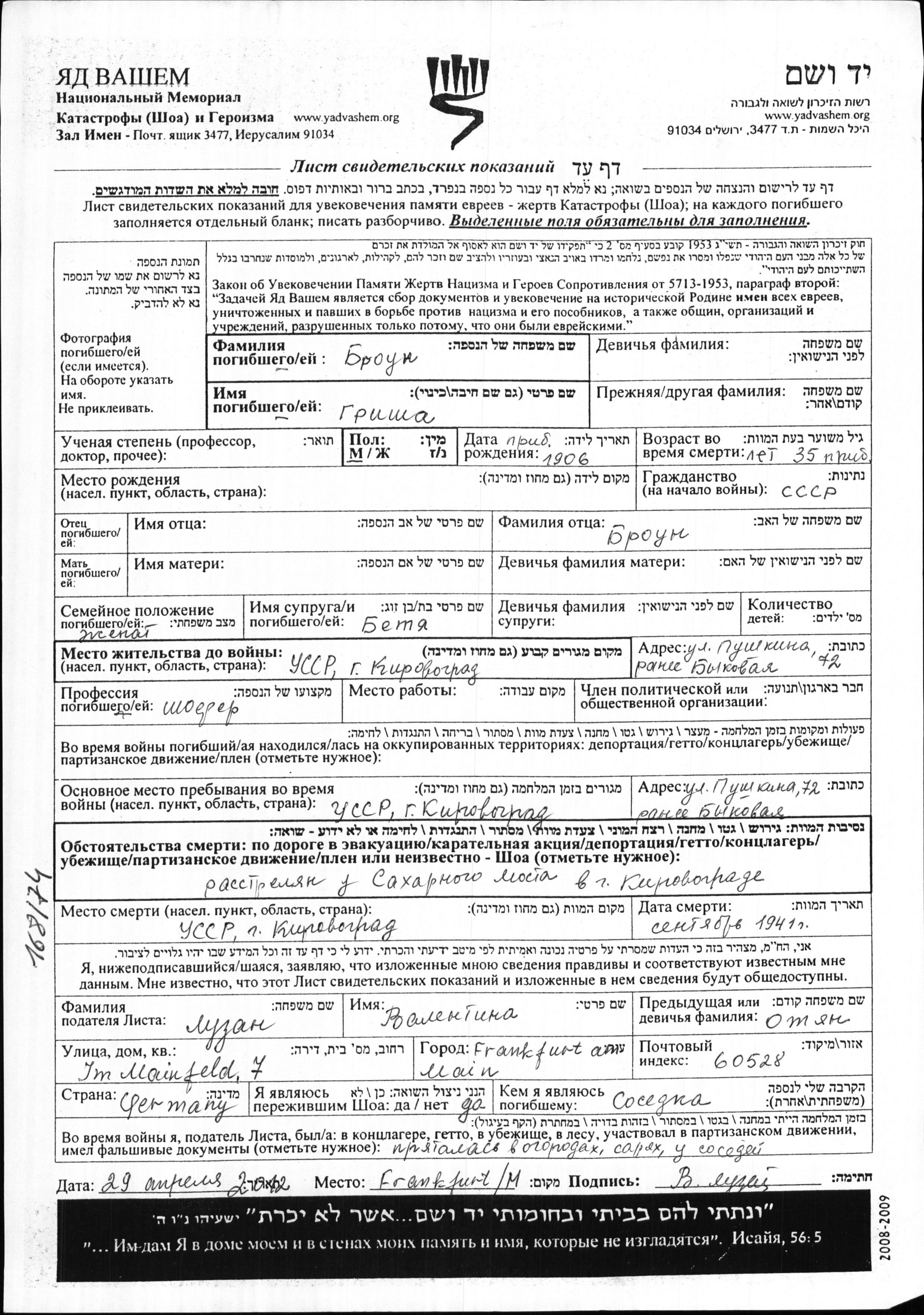 Grisha Broun wurde im Jahr 1906 geboren. Er war Chauffeur und mit Betya Verheiratet. Vor dem Zweiten Weltkrieg lebte er in Kirovograd, Ukraine (UdSSR). Während des Krieges war er in Kirovograd, Ukraine (UdSSR).