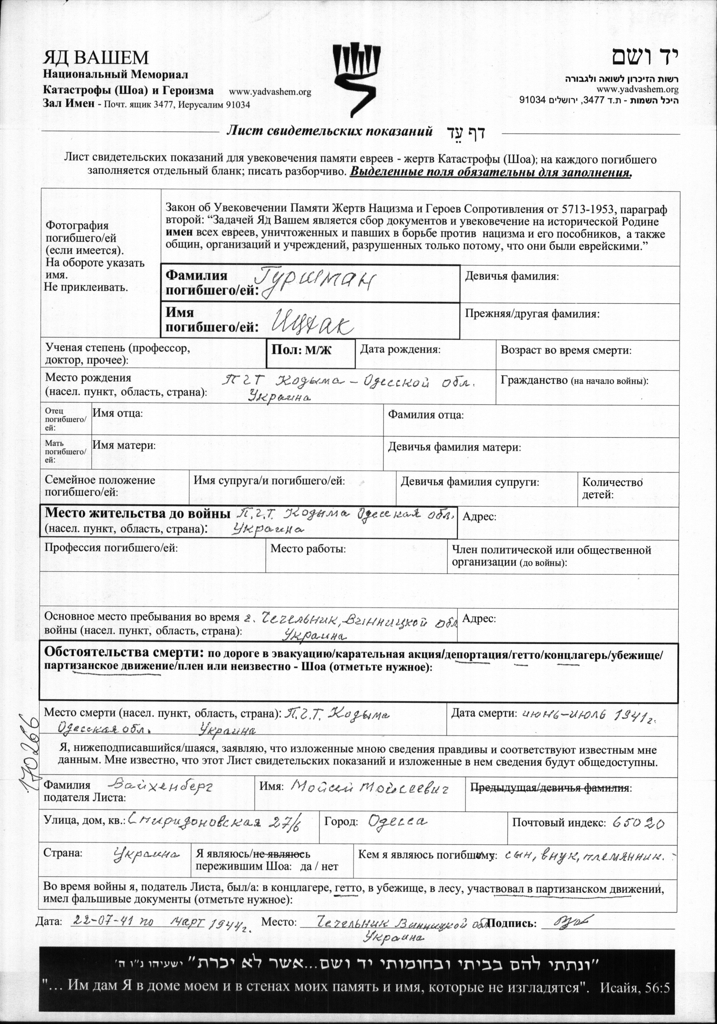 Aufenthaltsort während des Krieges/Schoah