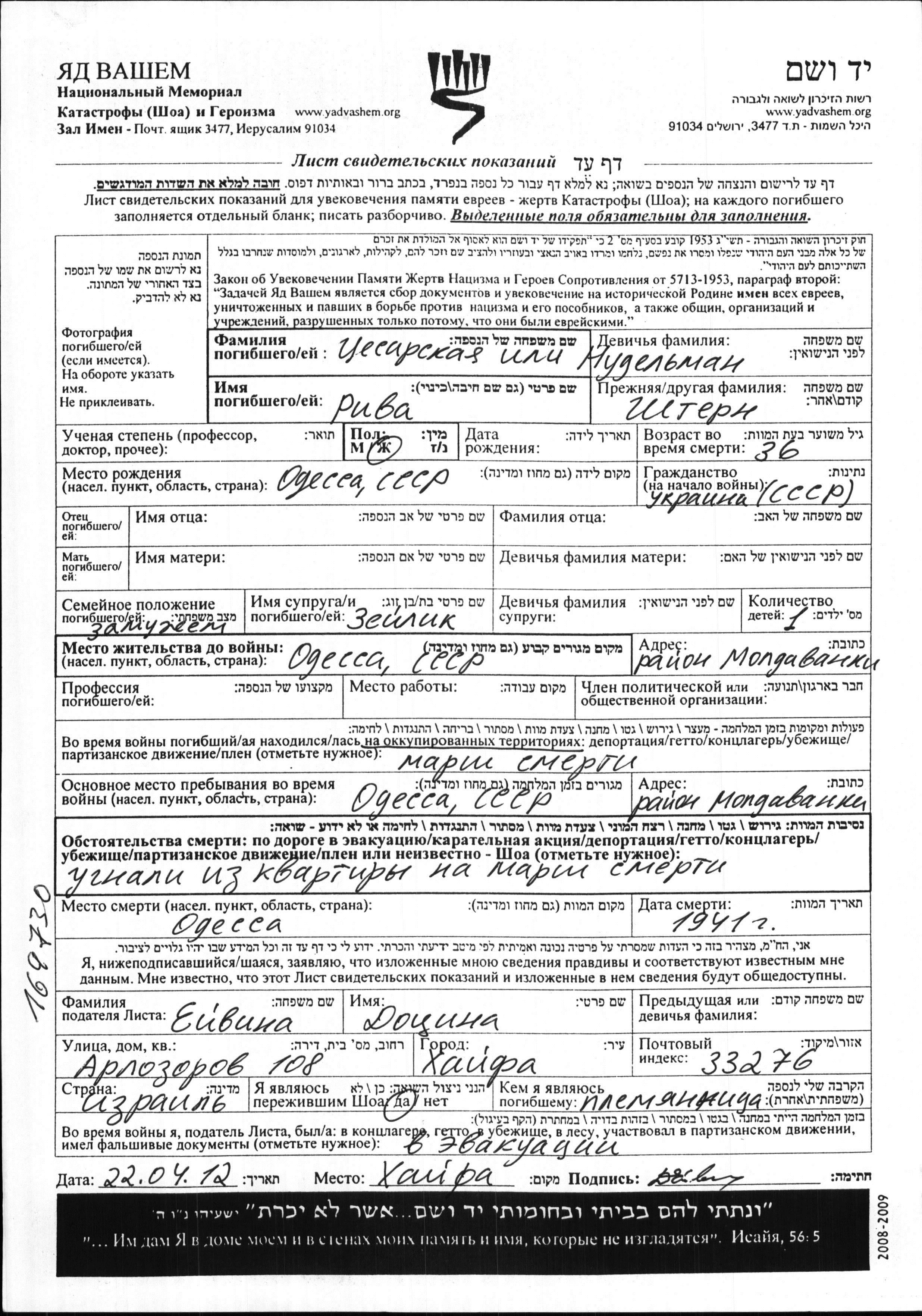 Riva wurde in der Schoah ermordet. Todesort: Odessa, Ukraine (UdSSR) im Jahr 1941.