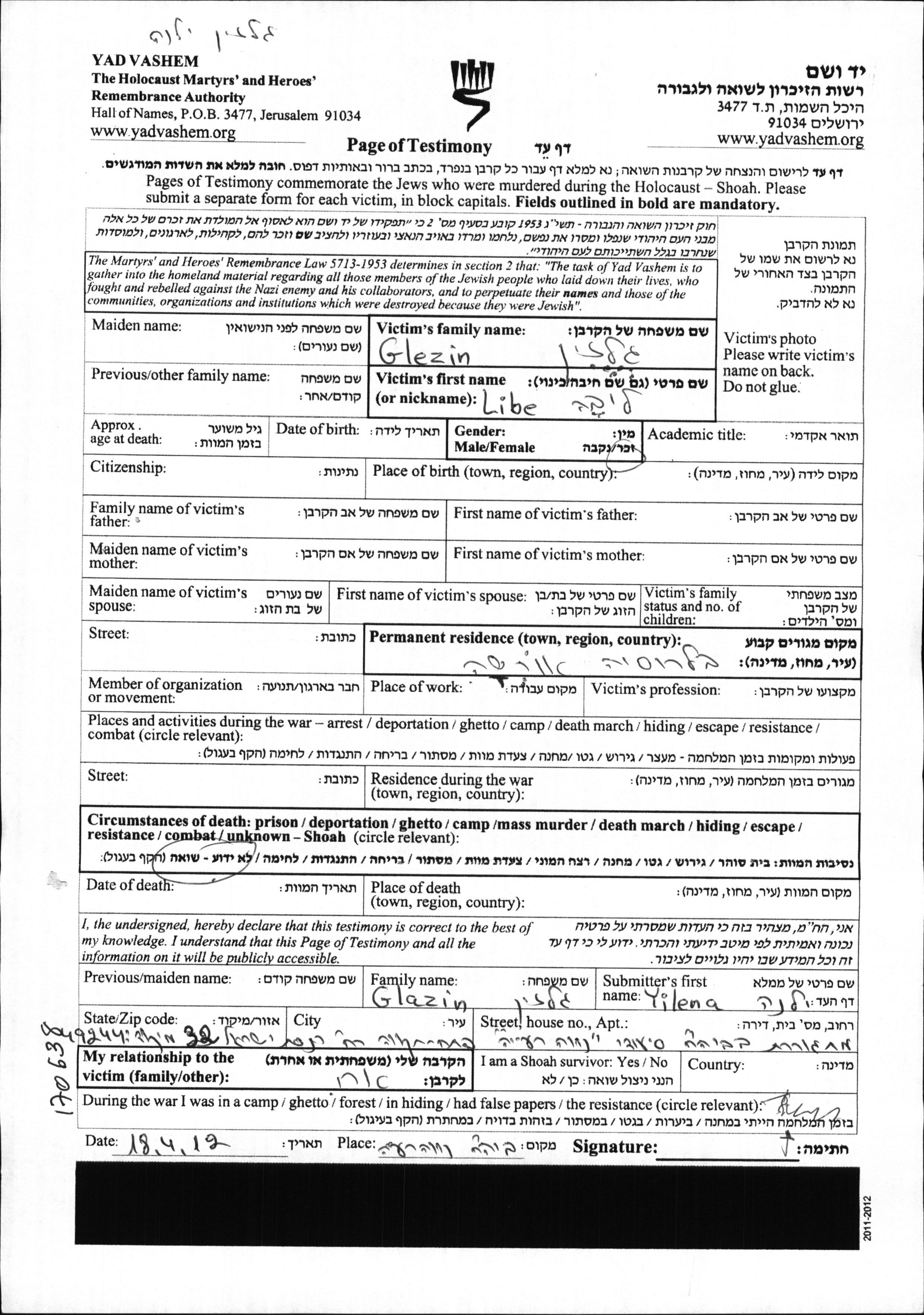 Libe Glezin. Vor dem Zweiten Weltkrieg lebte sie in Orsha, Weißrussland (UdSSR). Während des Krieges war sie in Weißrussland (UdSSR).