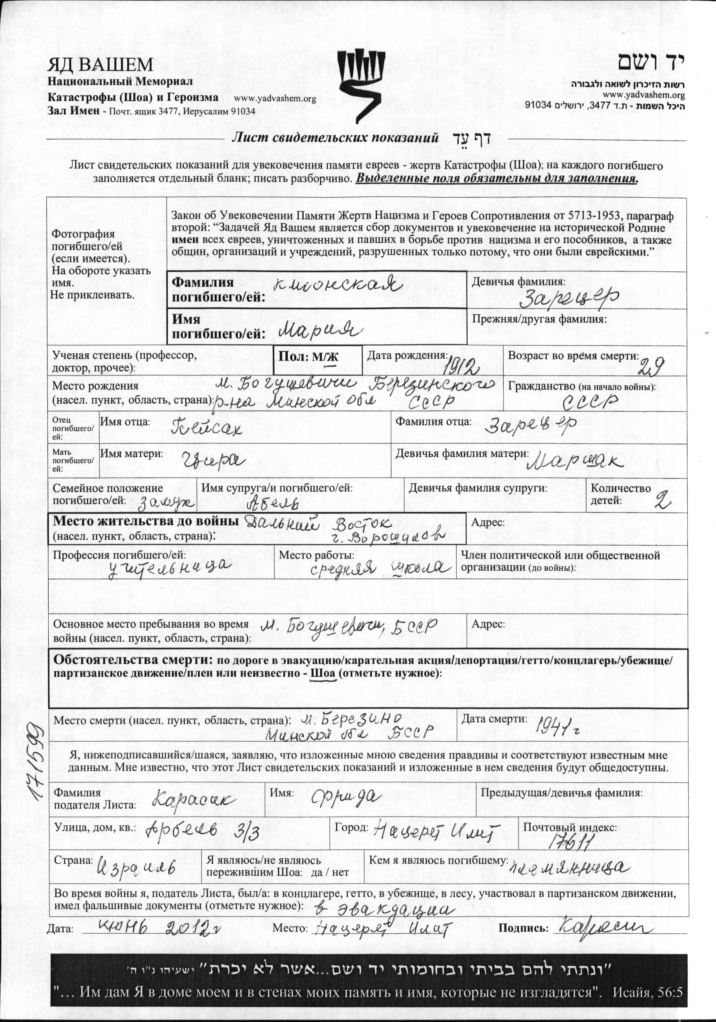 Mariya Klionskaya, geb. Zaretzer wurde im Jahr 1912 in Bogushevichi, Weißrussland (UdSSR) geboren. Sie war die Tochter von Peysakh und Tzira, geb. Marshak. Sie war Mittelschullehrer und mit Abel Verheiratet. Vor dem Zweiten Weltkrieg lebte sie in Voroshilov, Russland (UdSSR). Während des Krieges war sie in Bogushevichi, Weißrussland (UdSSR).