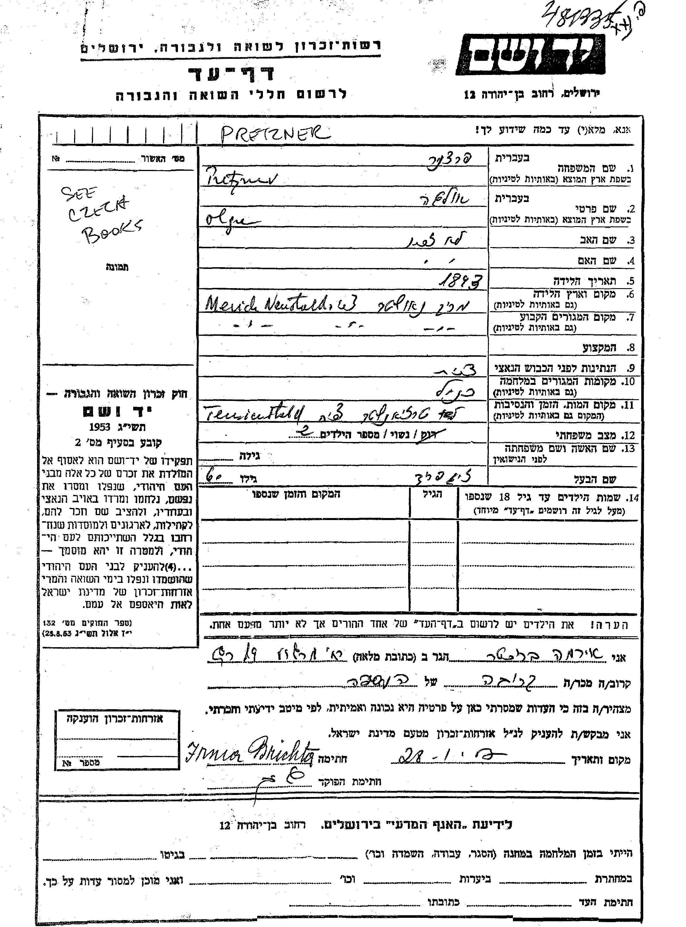 Olga Pritzner wurde im Jahr 1893 in Maehrisch Neustadt, Tschechoslowakei geboren. Sie war mit Zigfrid Verheiratet. Vor dem Zweiten Weltkrieg lebte sie in Maehrisch Neustadt, Tschechoslowakei. Während des Krieges war sie in Maehrisch Neustadt, Tschechoslowakei.
