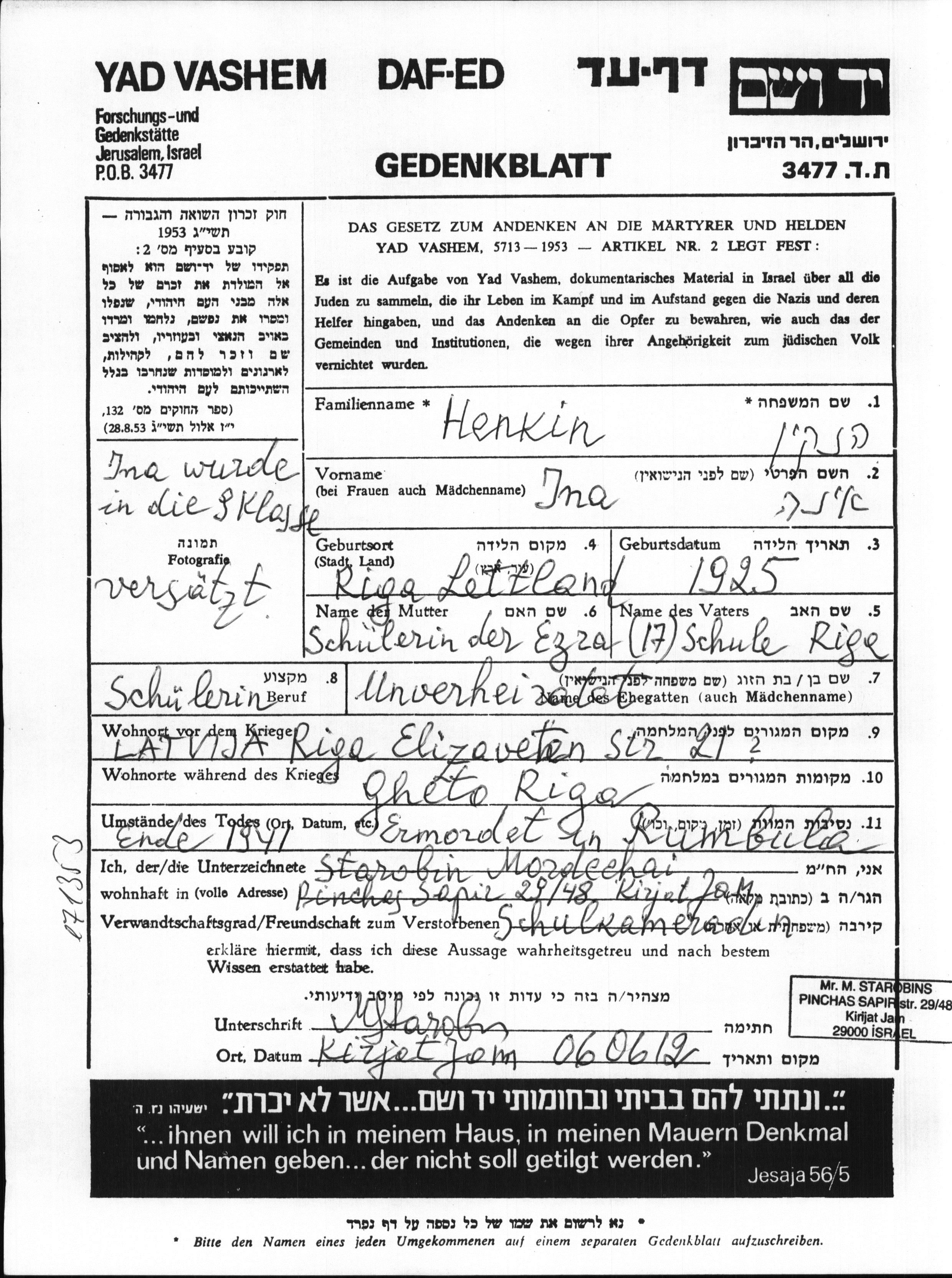 Henkin Ina 1925 Riga, Lettland Gedenkblatt