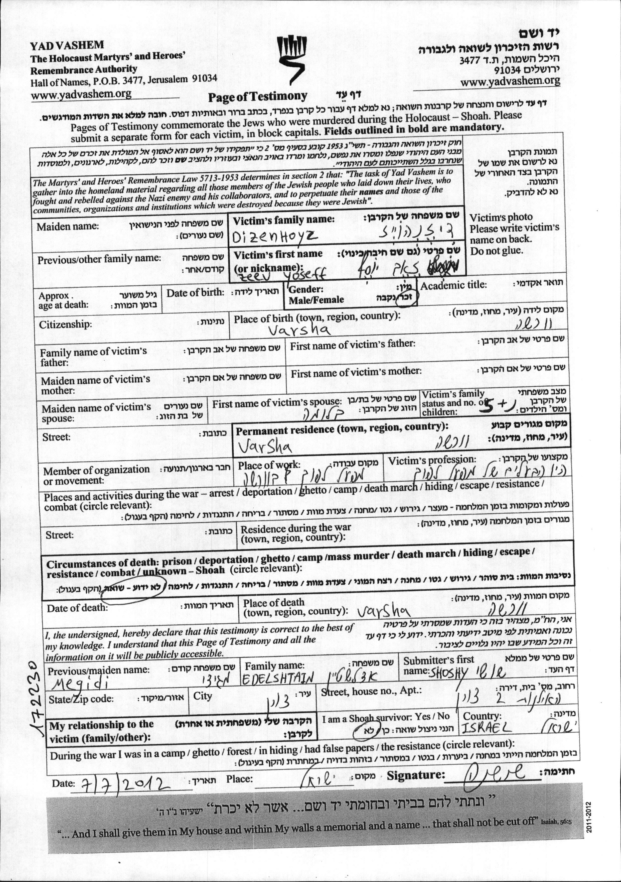 Zeev Yoseff Dizenhoyz wurde in Warszawa, Polen geboren. Er war Betriebsinhaber und mit Bluma Verheiratet. Vor dem Zweiten Weltkrieg lebte er in Warszawa, Polen. Während des Krieges war er in Warszawa, Polen.