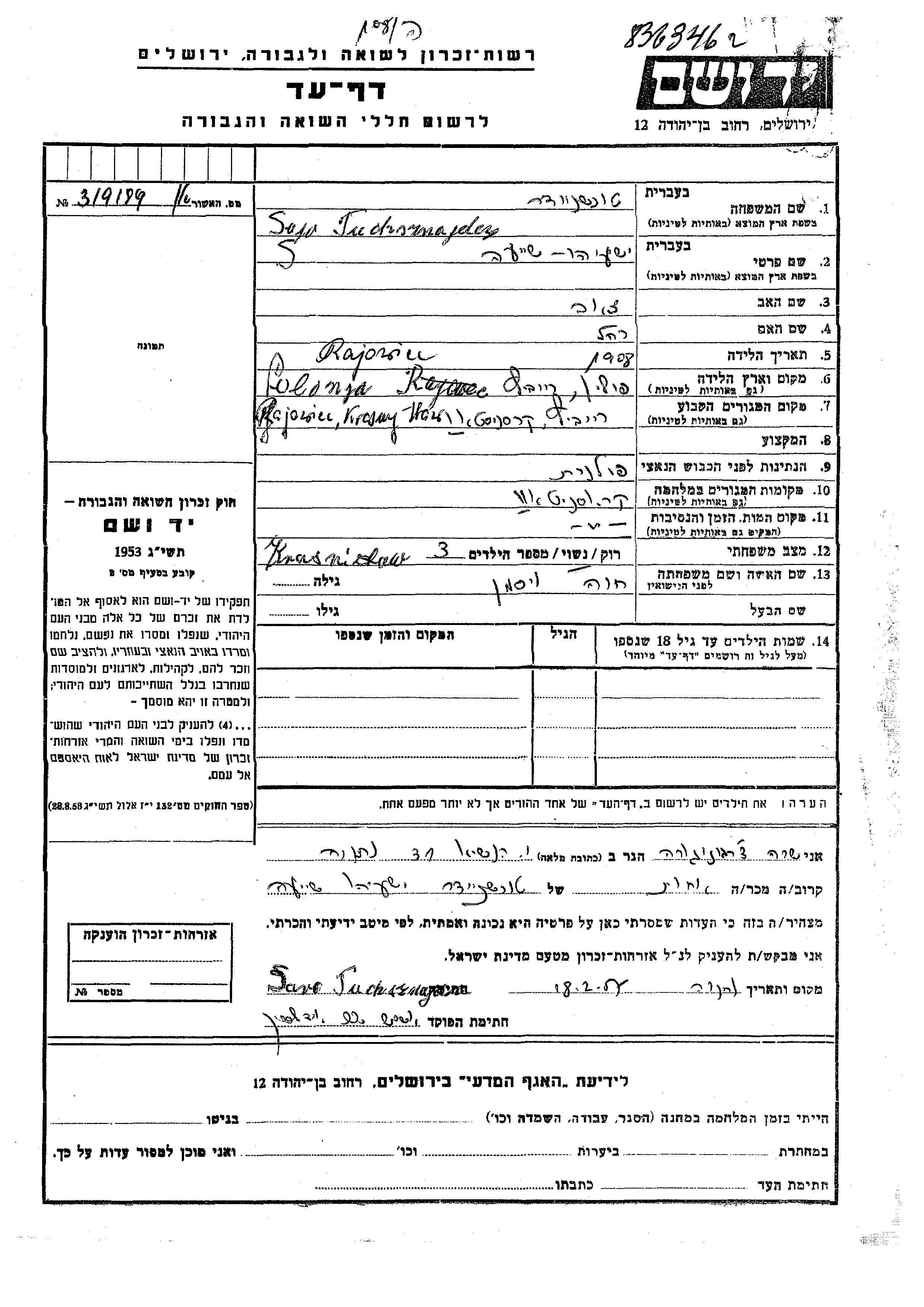 Yeshayahu Shiye wurde in der Schoah ermordet. Todesort: Krasnistav, Polen.