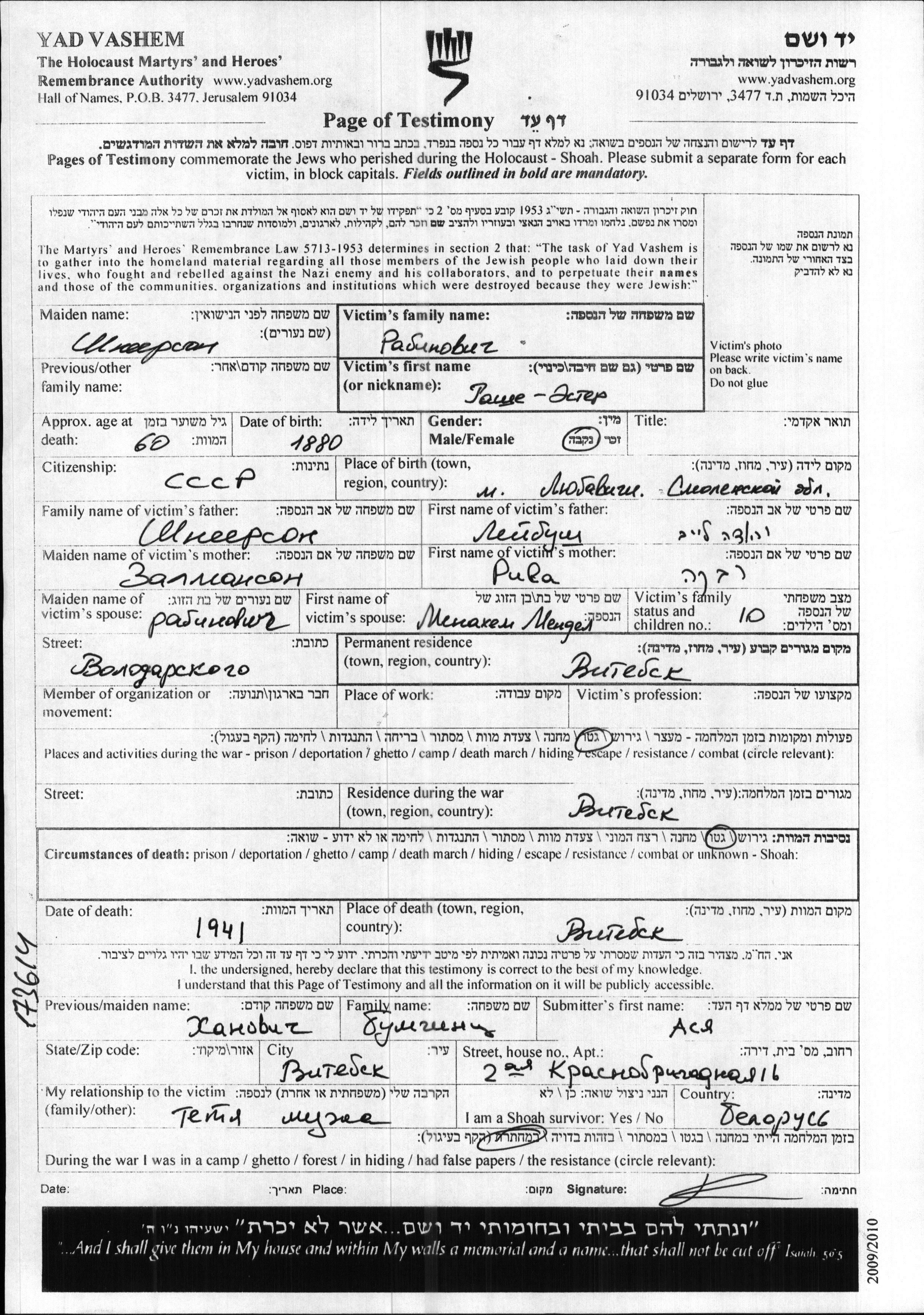 Rashe Ester Rabinovich, geb. Shneyerson wurde im Jahr 1880 in Lyubavichi, Russland (UdSSR) geboren. Sie war die Tochter von Yehuda Leyb und Rivka, geb. Zalmanson. Sie war mit Menakhemendl Verheiratet. Vor dem Zweiten Weltkrieg lebte sie in Vitebsk, Weißrussland (UdSSR). Während des Krieges war sie in Vitebsk, Weißrussland (UdSSR).
