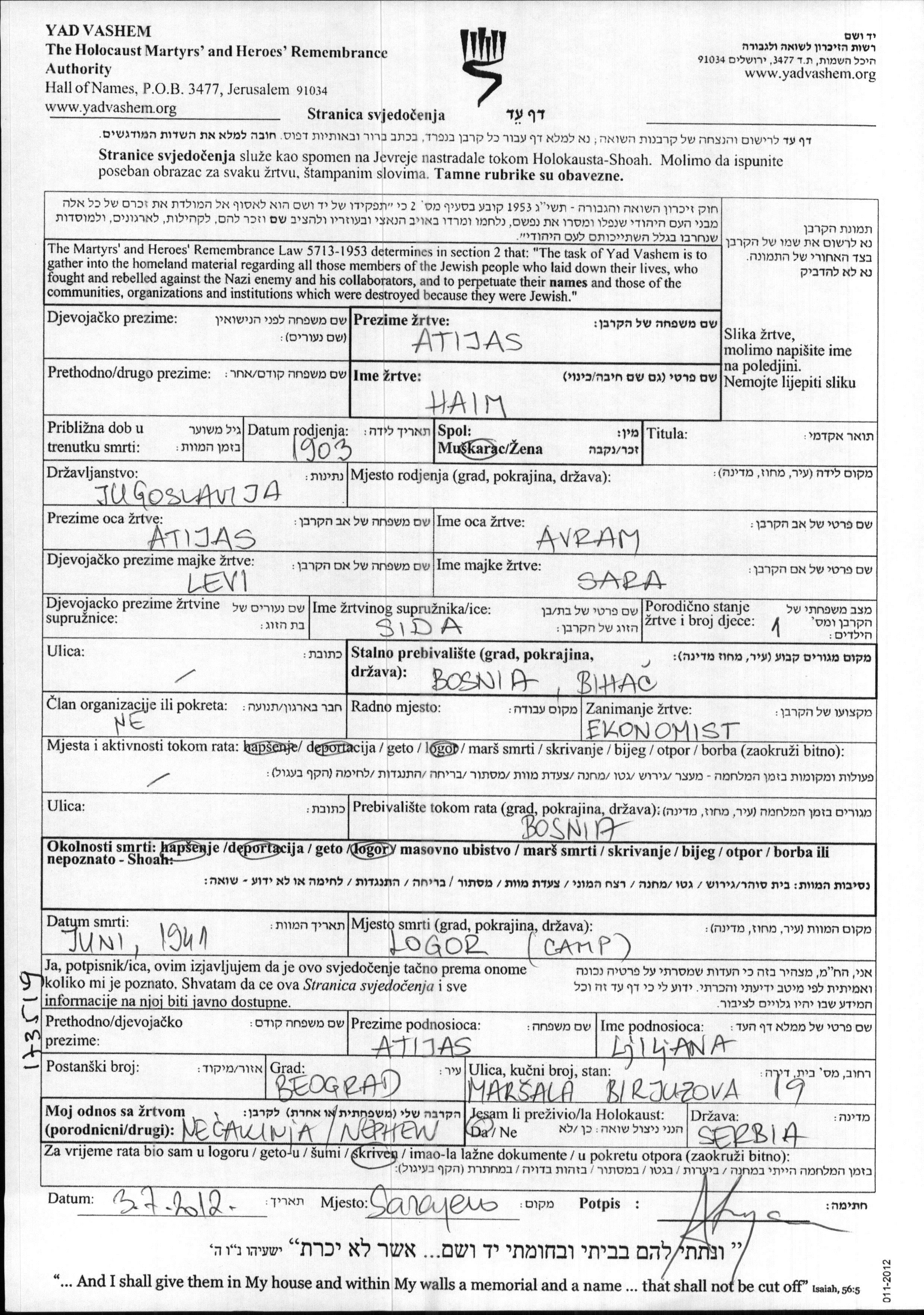 Haim Atijas wurde im Jahr 1903 in Jugoslawien geboren. Er war der Sohn von Avram und Sara, geb. Levi. Er war Ökonom/-in und mit Sida Verheiratet. Vor dem Zweiten Weltkrieg lebte er in Bihac, Jugoslawien. Während des Krieges war er in Bosnia and Herzegovina, Jugoslawien.