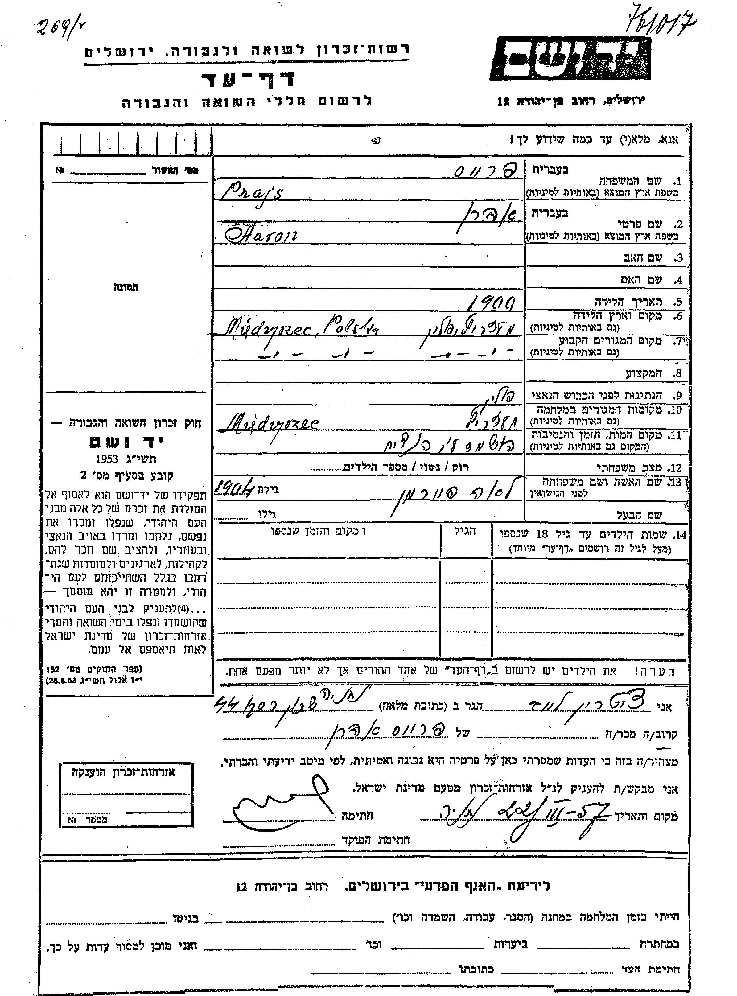 Haron Prajs wurde im Jahr 1909 in Miedzrizec, Polen geboren. Er war mit Lea, geb. Fairman Verheiratet. Vor dem Zweiten Weltkrieg lebte er in Miedzrizec, Polen. Während des Krieges war er in Miedzrizec, Polen.