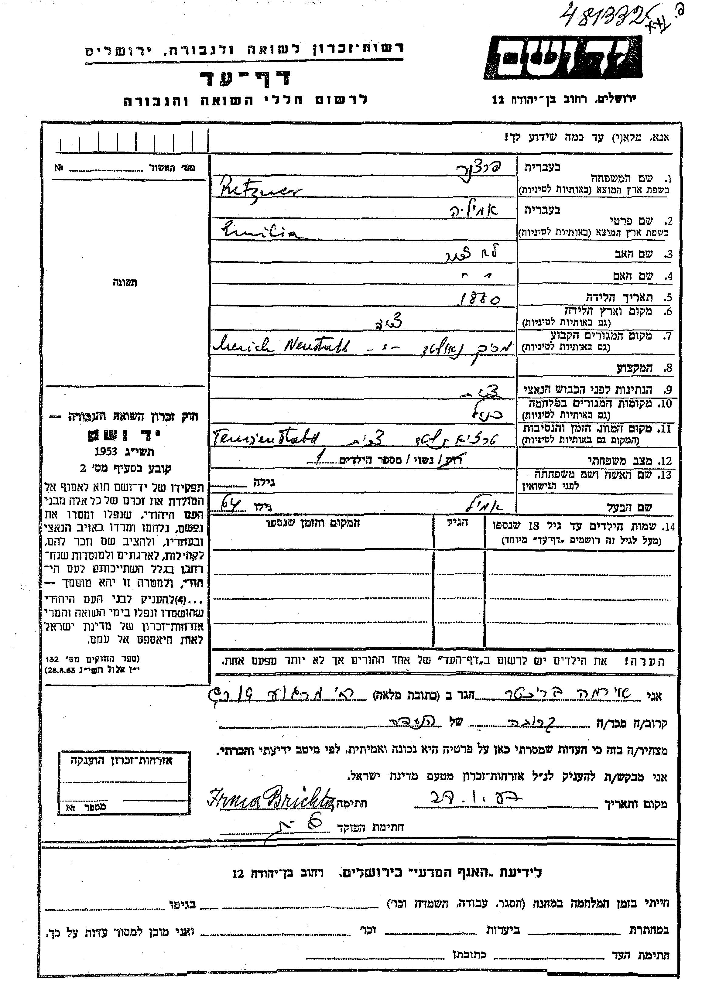 Emilia Pretzner wurde im Jahr 1880 in Tschechoslowakei geboren. Sie war mit Emil Verheiratet. Vor dem Zweiten Weltkrieg lebte sie in Maehrisch Neustadt, Tschechoslowakei. Während des Krieges war sie in Maehrisch Neustadt, Tschechoslowakei.